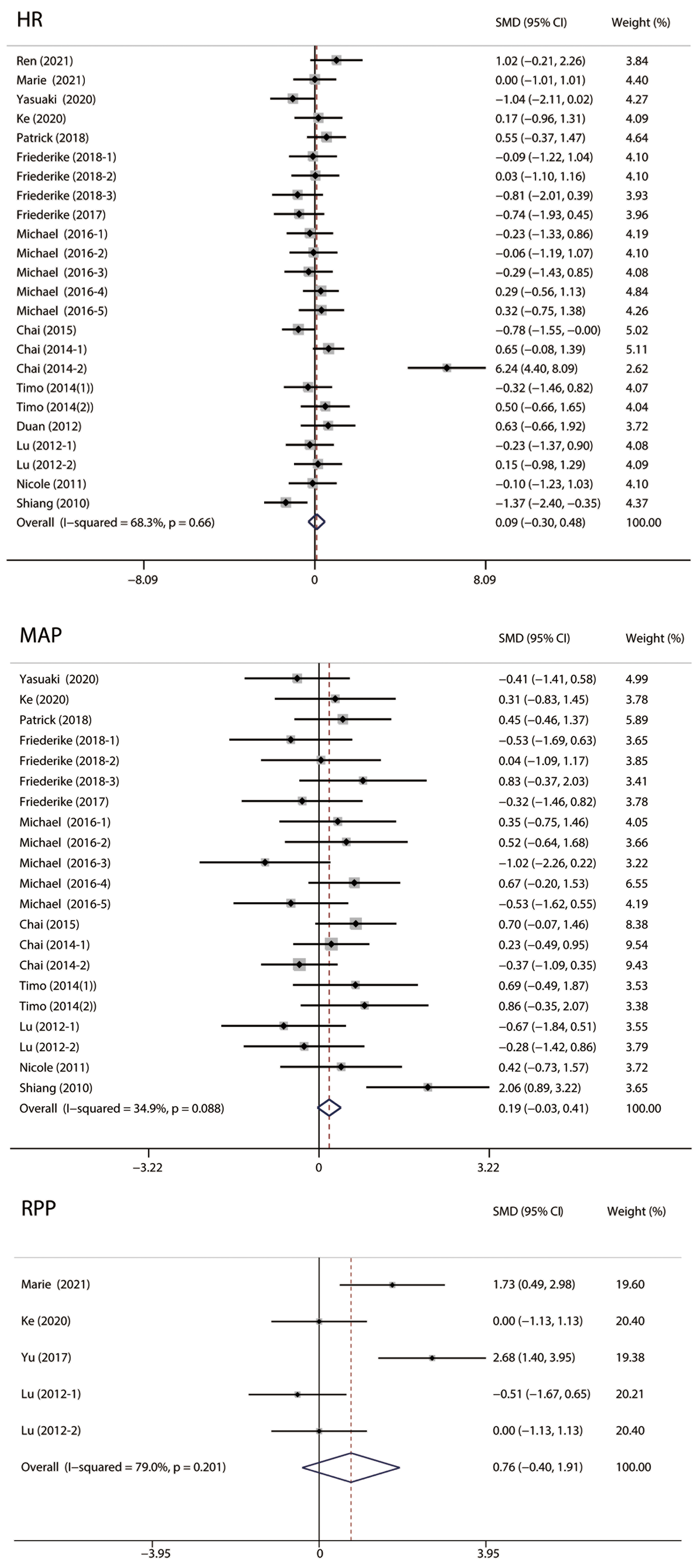 Fig. 6.Forest plots of vital signs. No significant difference was observed in HR, MAP and RPP. HR, heart rate; MAP, mean arterial pressure; RPP, heart rate-blood pressure product.