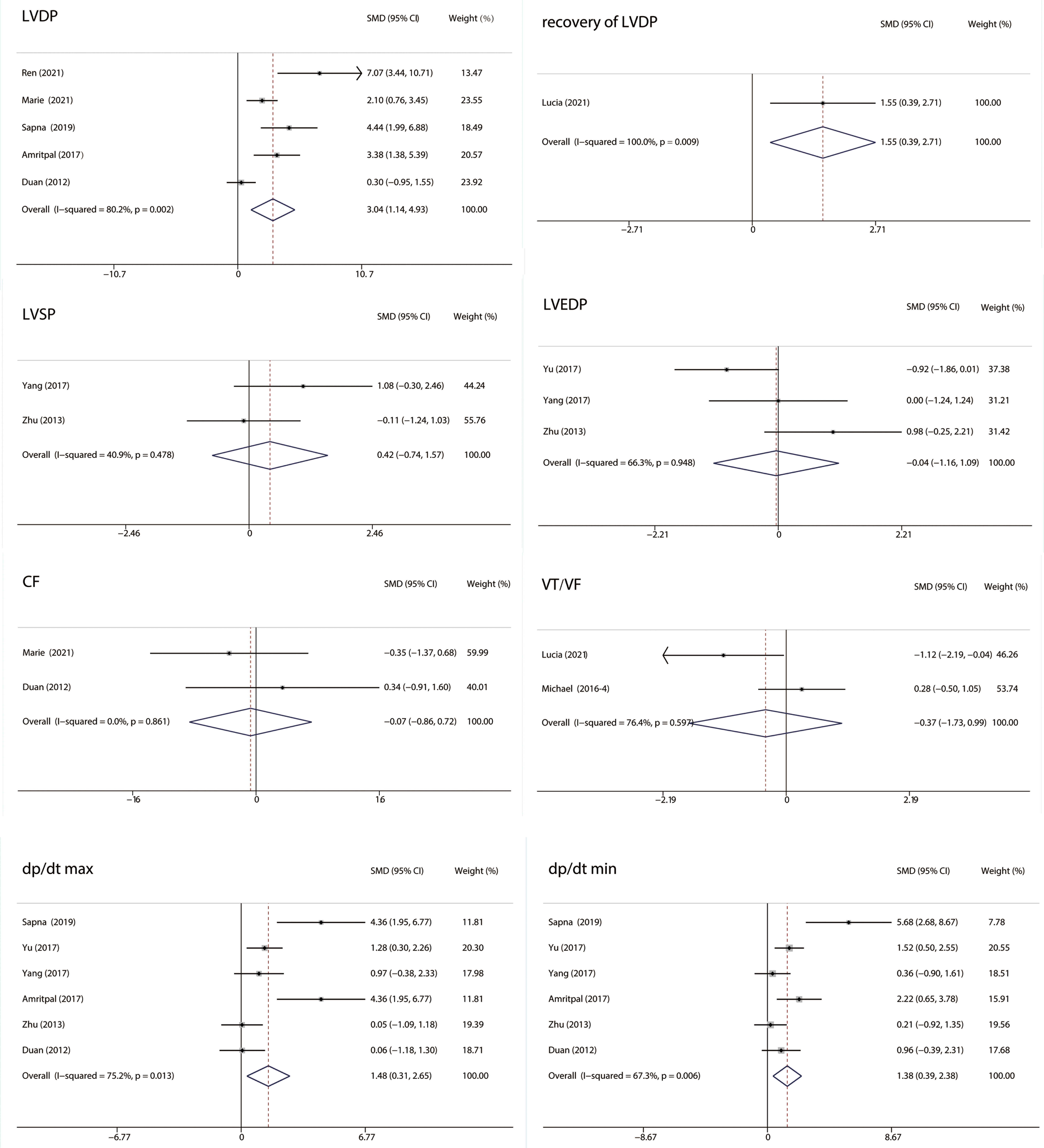 Fig. 7.Forest plots of hemodynamic parameters. LVDP, recovery of LVDP, dp/dt max, and dp/dt min were significantly higher in the RIPC group. No significant difference was observed in LVSP, LVEDP, CF, and VT/VF between the two groups. RIPC, remote Ischemic preconditioning; CI, confidence interval; SMD, standardized mean difference; CF, coronary flow; LVDP, left ventricular developed pressure; LVEDP, left ventricular end diastolic pressure; LVSP, left ventricular systolic pressure; VT, ventricular tachycardia; VF, ventricular fibrillation.