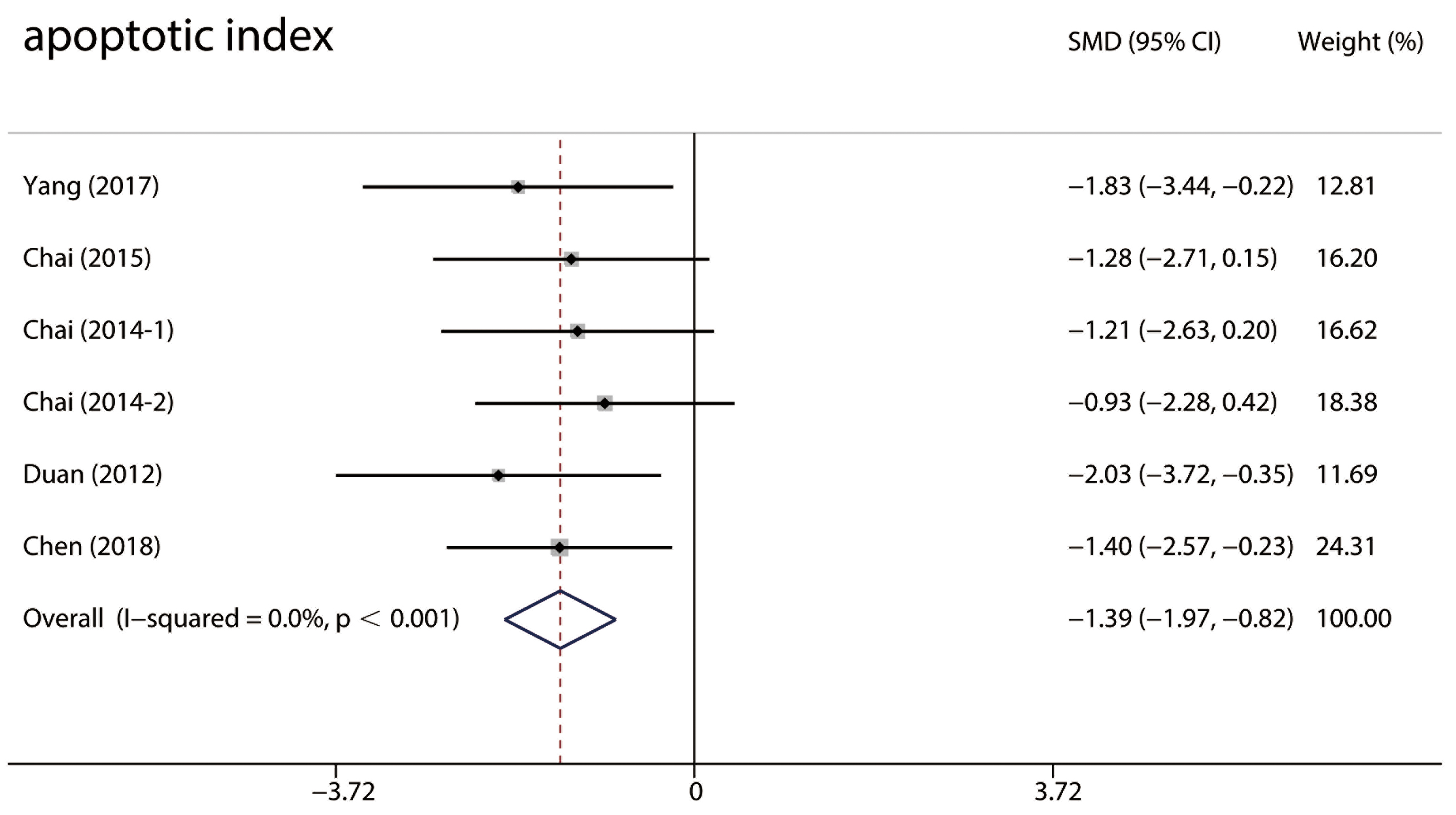 Fig. 8.Forest plots of the TUNEL-positive cells. TUNEL-positive cells in the RIPC group were significantly less compared with the control group in MIRI animals. RIPC, remote Ischemic preconditioning; CI, confidence interval; MIRI, myocardial ischemia-reperfusion injury; SMD, standardized mean difference.