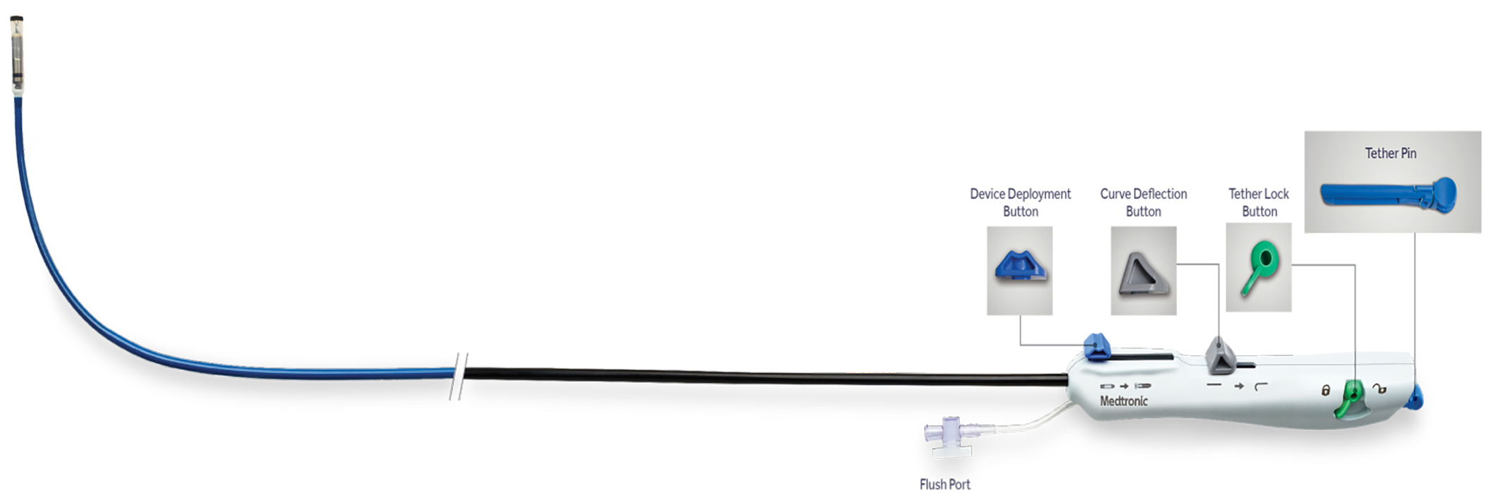 Fig. 1.Micra Integrated Delivery Catheter. 105 cm long catheter system with a handle that controls deflection and deployment of the Micra pacing capsule (23 Fr inner diameter/27 Fr outer diameter). Courtesy of Medtronic Inc.