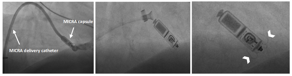 Fig. 2.MICRA deployment steps. Left panel: Delivery catheter is advanced to the right ventricle and contrast medium is injected to confirm appropriate positioning. Middle panel: MICRA capsule is released, and a tug test is performed to verify stability. Right panel: MICRA device in place (arrowheads show nitinol tines).