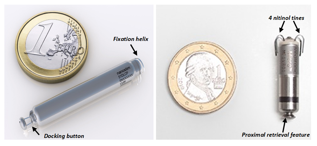 Fig. 3.Nanostim LCP (on the left) and Micra TPS (on the right) dimensions compared with a coin. Attchment and retrieval features are shown for both devices.