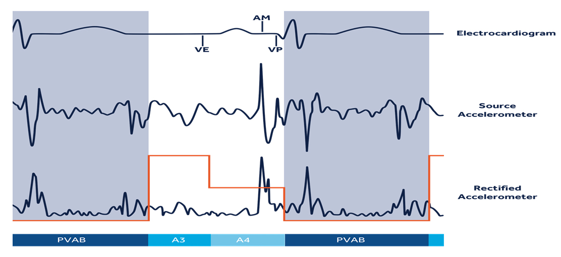 Fig. 4.Micra AV accelerometer signals. PVAB period: The A1 and A2 signals are blanked. No atrial sensing occurs during PVAB. A1: Start of ventricular systole, mitral and tricuspid valves close. A2: End of ventricular systole, aortic and pulmonic valves close. A3 detection window: Diastole, passive blood flow from atrium to ventricle (corresponds to E-wave on Doppler echo). Micra AV is designed to avoid detecting the A3 signal. A4 detection window: atrial systole, blood pushed into ventricles, corresponds to A-wave on Doppler echo. Courtesy of Medtronic Inc. Abbreviations: PVAB, post ventricular atrial blanking period.