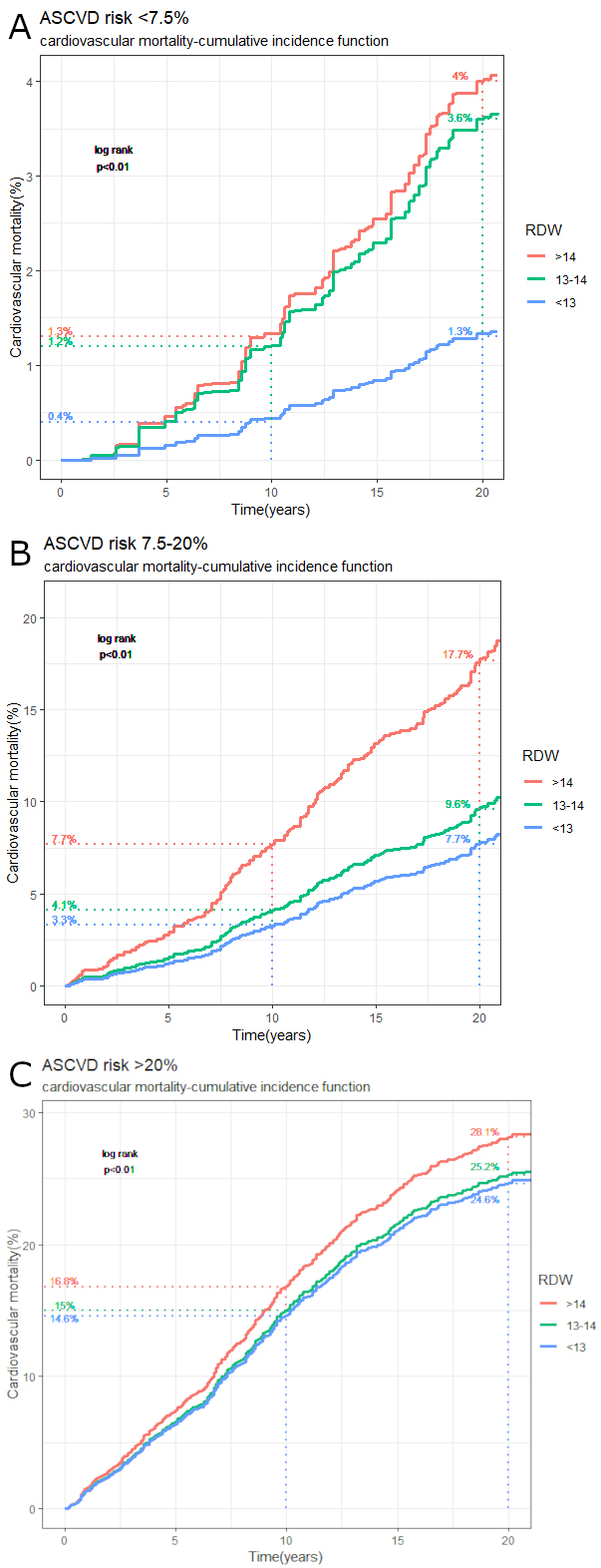 Our study demonstrated that an increase in RDW greater than 14 was associated with significantly increased cardiovascular mortality in all ASCVD risk groups using the NHANES III database between 1988–1994, especially in the low and the intermediate-ASCVD risk cohort where RDW had the highest impact. Therefore, RDW may be a potential risk enhancer, similar to hs-CRP and in lieu of hs-CRP, especially for the intermediate-ASCVD risk population of people in the United States. An elevated RDW believed to be related to inflammatory and oxidative stress factors may become clinically helpful to further risk stratify individuals for cardiovascular mortality in conjunction with the use of the ASCVD risk assessment. Further validation of our study results is required.