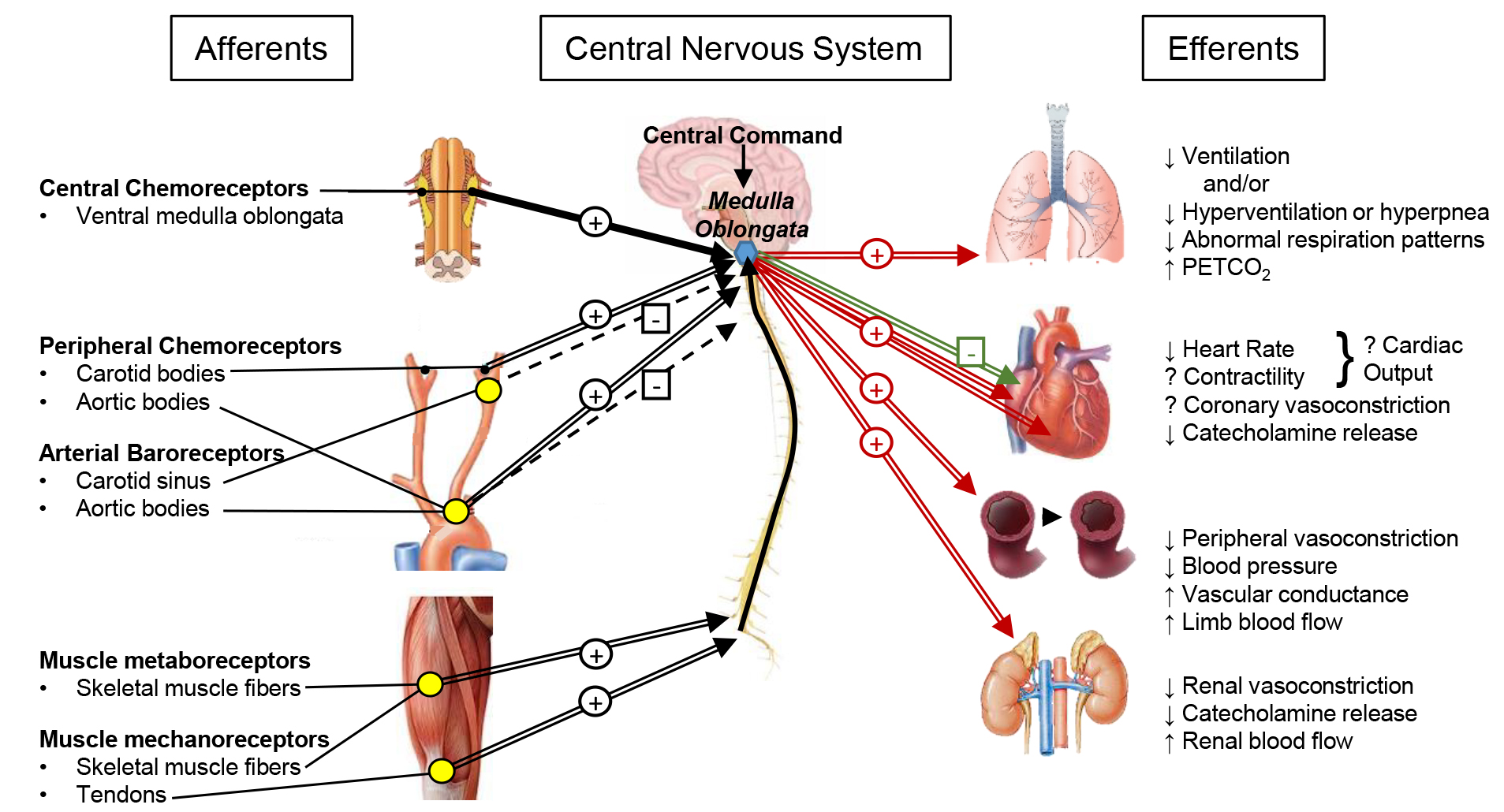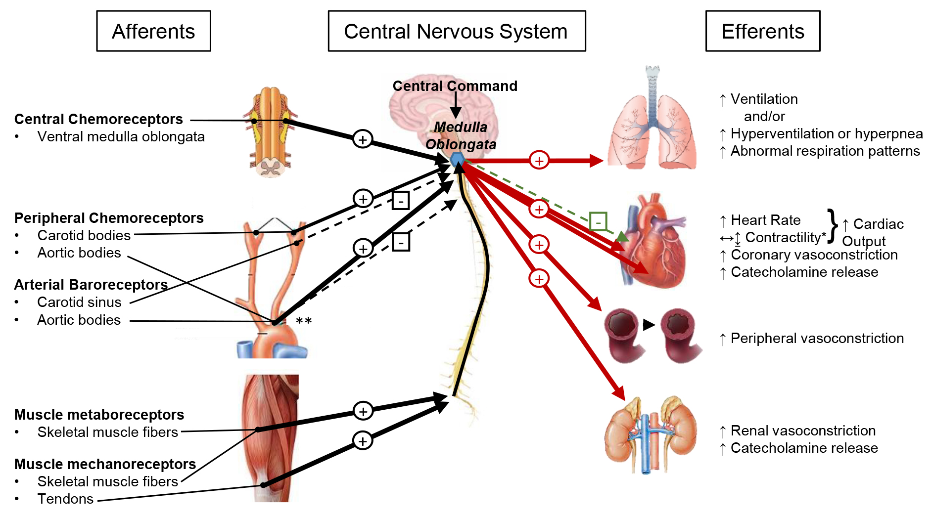 contribute to exaggerated sympathoexcitation, hyperventilation, breathing
