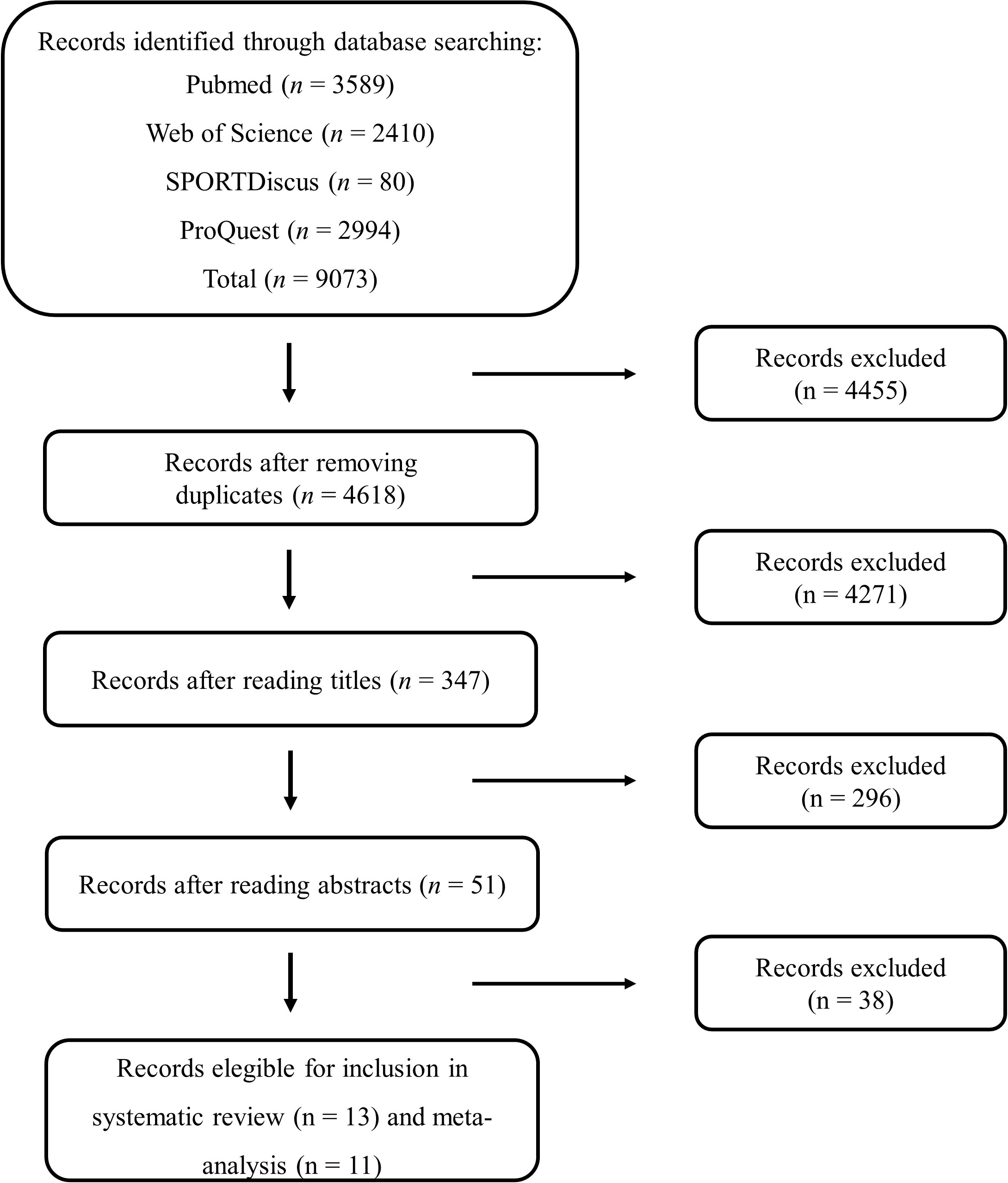 In total, 9073 studies were identified through the database and reference searches. After the selection process based on eligibility criteria, 13 and 11 studies were included in the systematic review and meta-analysis, respectively (Fig. 1).