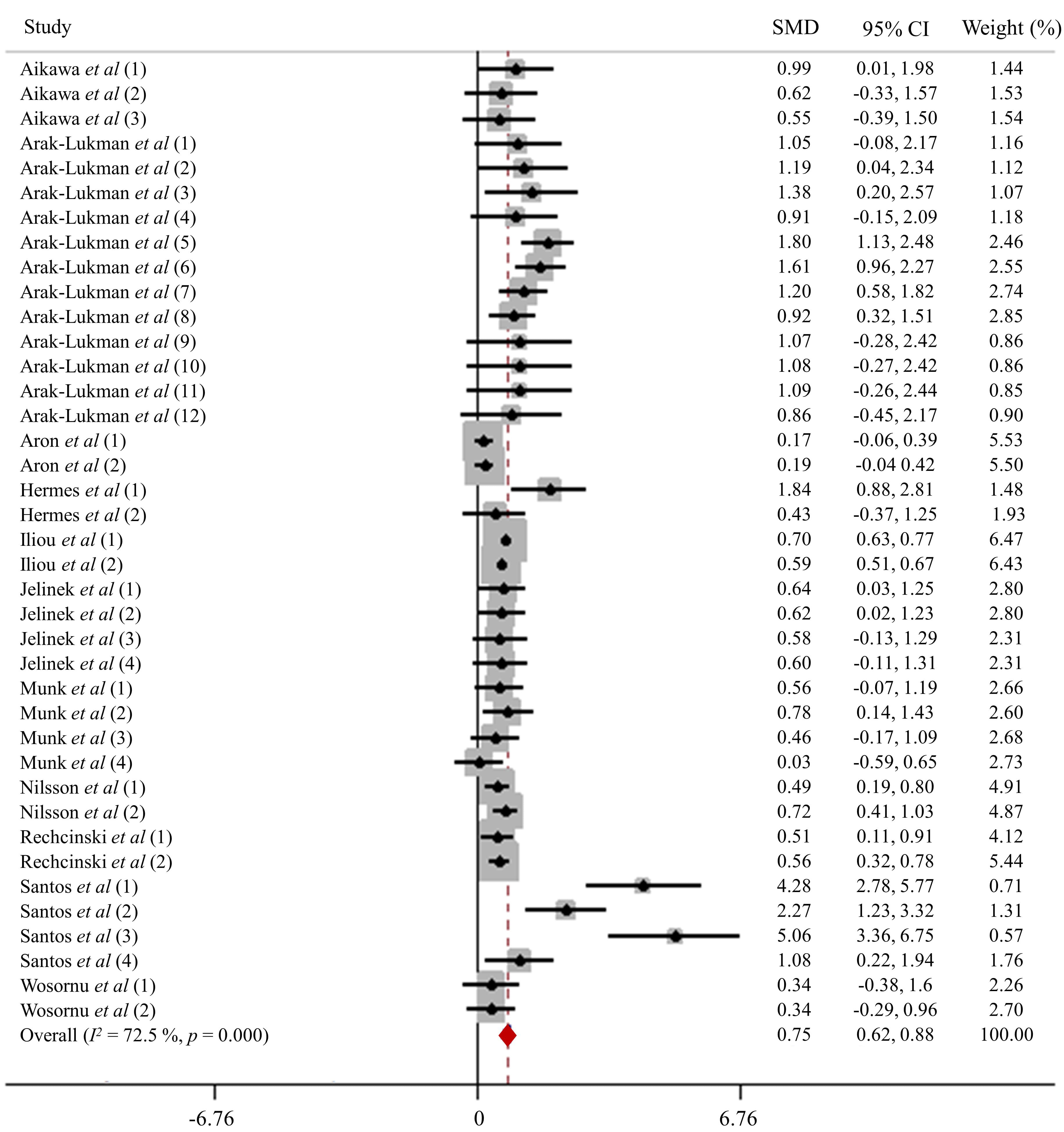 meta-analysis. The mean effect size was 0.75 (95% CI 0.62, 0.88), which