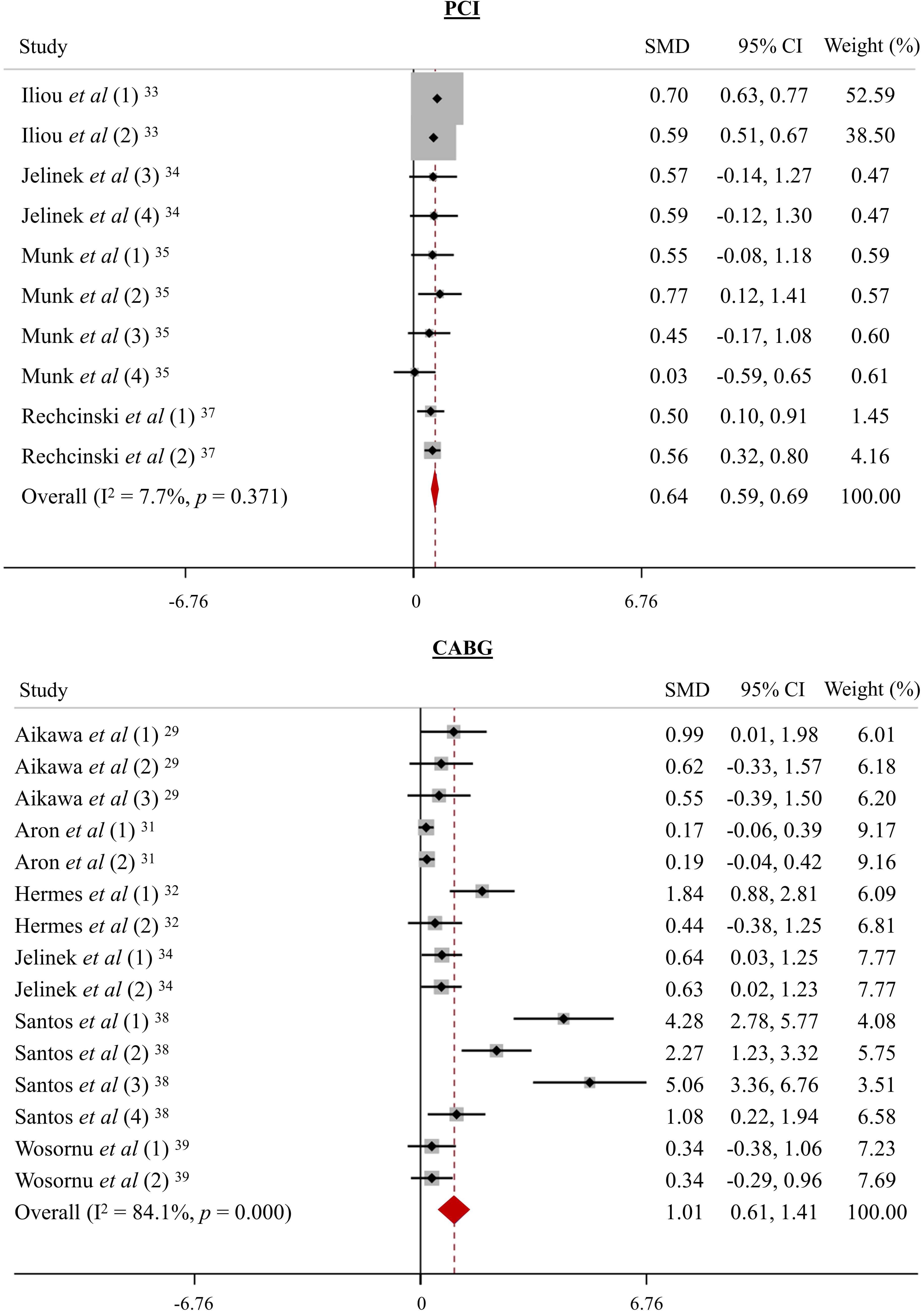 Fig. 3.Forest plot of physical performance following physical training in patients undergoing CABG or PCI. SMD, standardized mean difference.