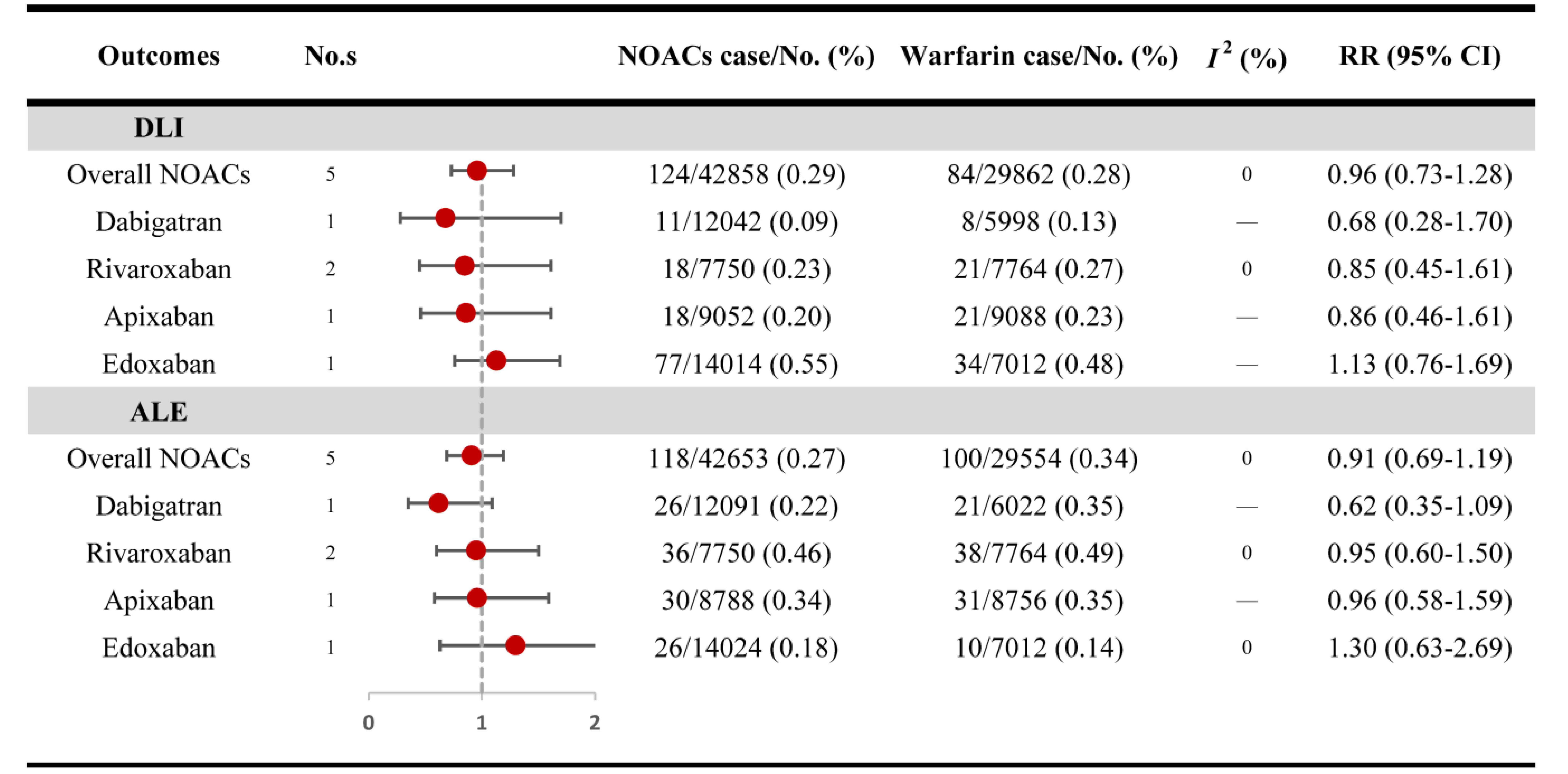 For RCTs, NOACs use was not associated with an increased risk of DLI (RR: 0.96,