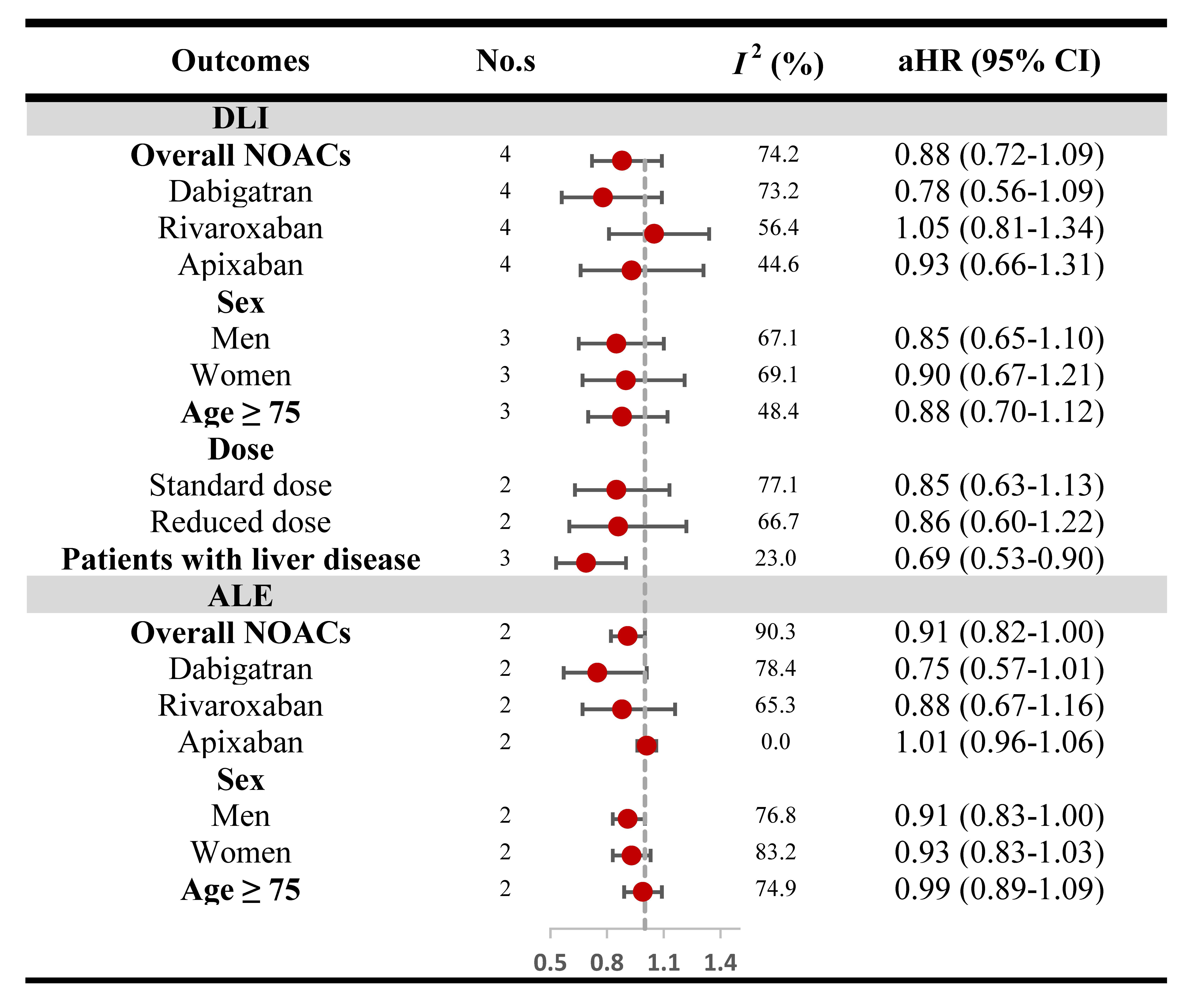 Fig. 3.Risk of DLI and ALE in RWSs. DLI, diagnostic liver injury; ALE, abnormal liver enzyme; RWSs, real-world studies; aHR, adjusted hazard risk; CI, confidence interval; NOACs, non–vitamin K antagonist oral anticoagulant.