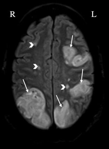 Fig. 1.Evidence of multiple bilateral cerebral infarcts in a patient with nonbacterial thrombotic endocarditis (arrows: large infarcts, arrowheads: smaller infarcts) detected by brain magnetic resonance imaging. L, left; R, right.