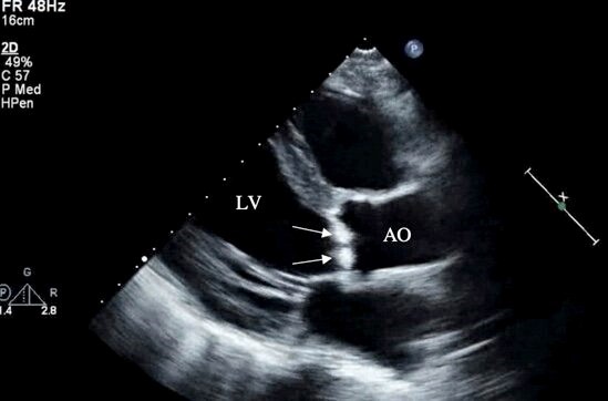 Fig. 2.Transthoracic echocardiography (parasternal long axis view) of a patient with nonbacterial thrombotic endocarditis showing large irregular hyperechoic lesions consistent with vegetations on the aortic valve (arrows). LV, left ventricle; AO, ascending aorta.
