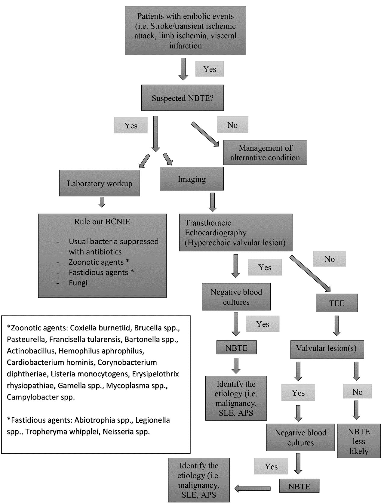 Diagnosis requires a high index of suspicion, as risk factors such as malignancy, SLE, or APS may be absent. Blood culture negative infective endocarditis (BCNIE) should be excluded before considering NBTE diagnosis (Fig. 3). Various diagnostic tests including different culture media, serological tests and polymerase chain reaction should be considered to exclude BCNIE [40]. A thorough history is essential in guiding further investigation and identification of the offending microorganism in BCNIE. A history of antibiotic therapy, even as brief as 2 to 3 days prior to blood cultures, should be explored as it is a common cause of BCNIE [40]. A variety of animal exposures, contact with sheep and cattle, human body louse, and cats suggests infection with Coxiella burnetii, Bartonella quintana and Bartonella henselae. Travel to the Middle East and ingestion of unpasteurized milk suggest infection with Brucella species. Legionella should be suspected from a history of recent hospitalization, and fungal infection should be excluded in patients with prolonged antibiotic therapy and immunosuppression [40]. After ruling out BCNIE, patients suspected of having NBTE should be evaluated with TTE, and inconclusive findings followed by TEE. However, even TEE may be unrevealing if only small remnants of prior vegetations remain on cardiac valves.