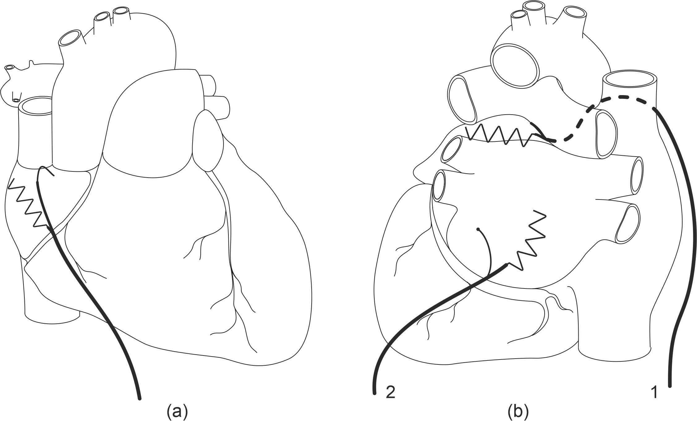 Fig. 2.Schematic drawing of a human heart [front (a) and back view (b)] showing the atrial temporary wire electrodes in place. The distal 10 cm of the electrode (anode) formed as a zigzag were placed at the right (a) and left atria (b), respectively. On the right side (b), back view of the heart, the electrodes were either placed via transvers sinus (1) or fixed on the left atrium (2).