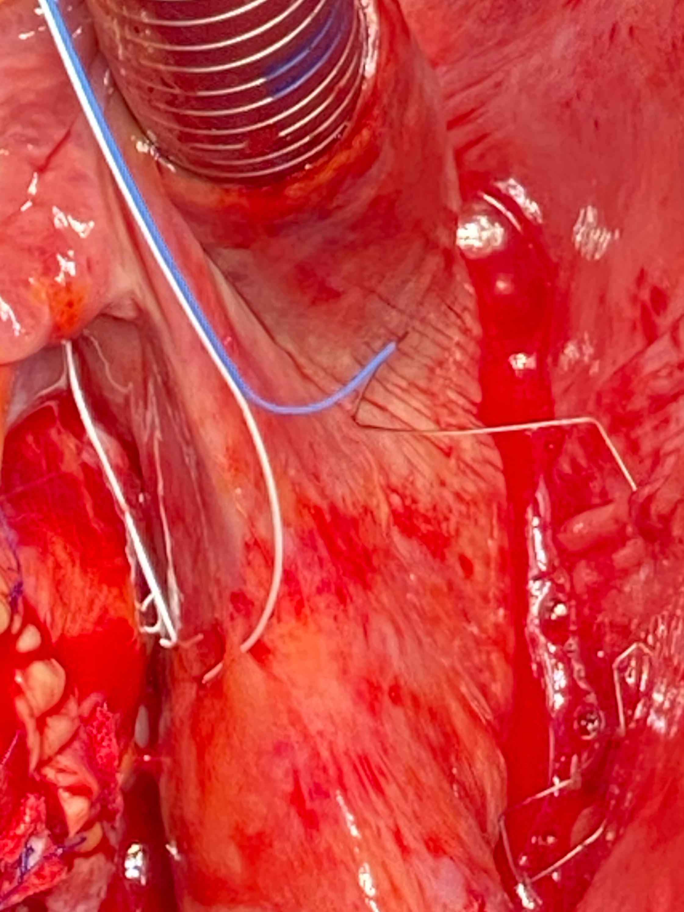 Fig. 4.Implantation of the atrial TMA® electrodes with needles: placement of the right wire with anode stitched to the pericardium and the cathode on the superior vena cava.