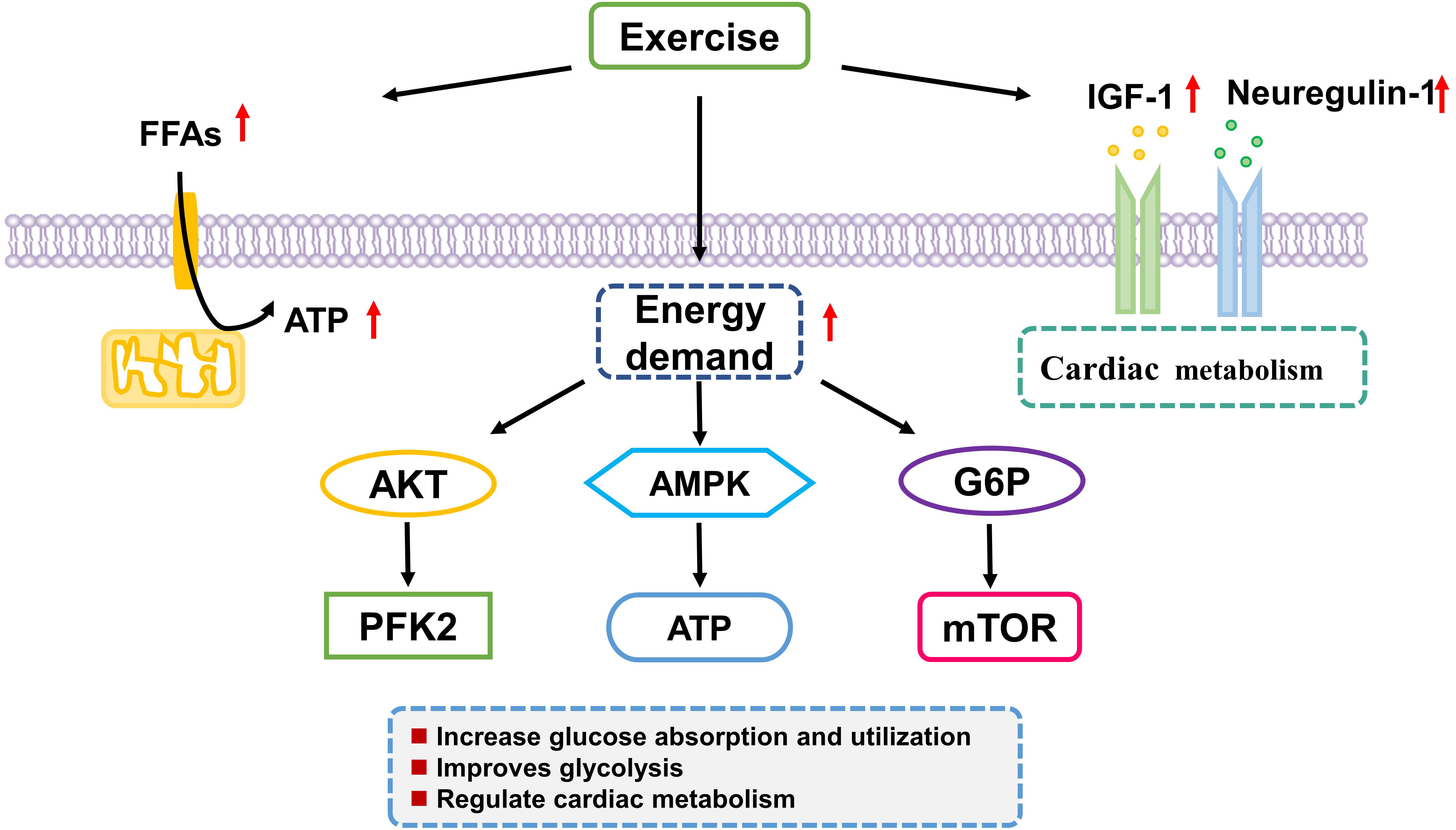 Fig. 2.Exercise training regulates myocardial cells energy metabolism. Exercise training causes adaptations in energy metabolism of the heart including glucose absorption and utilization and glycolysis. Akt, serine/threonine kinase; FFA, plasma free fatty acid; AMPK, AMP Activated Protein Kinase PFK2, 6-phosphofructo-2-kinase/fructose-2,6-bisphosphatase; ATP, adenosine triphosphate; G6P, glucose-6-phosphate.