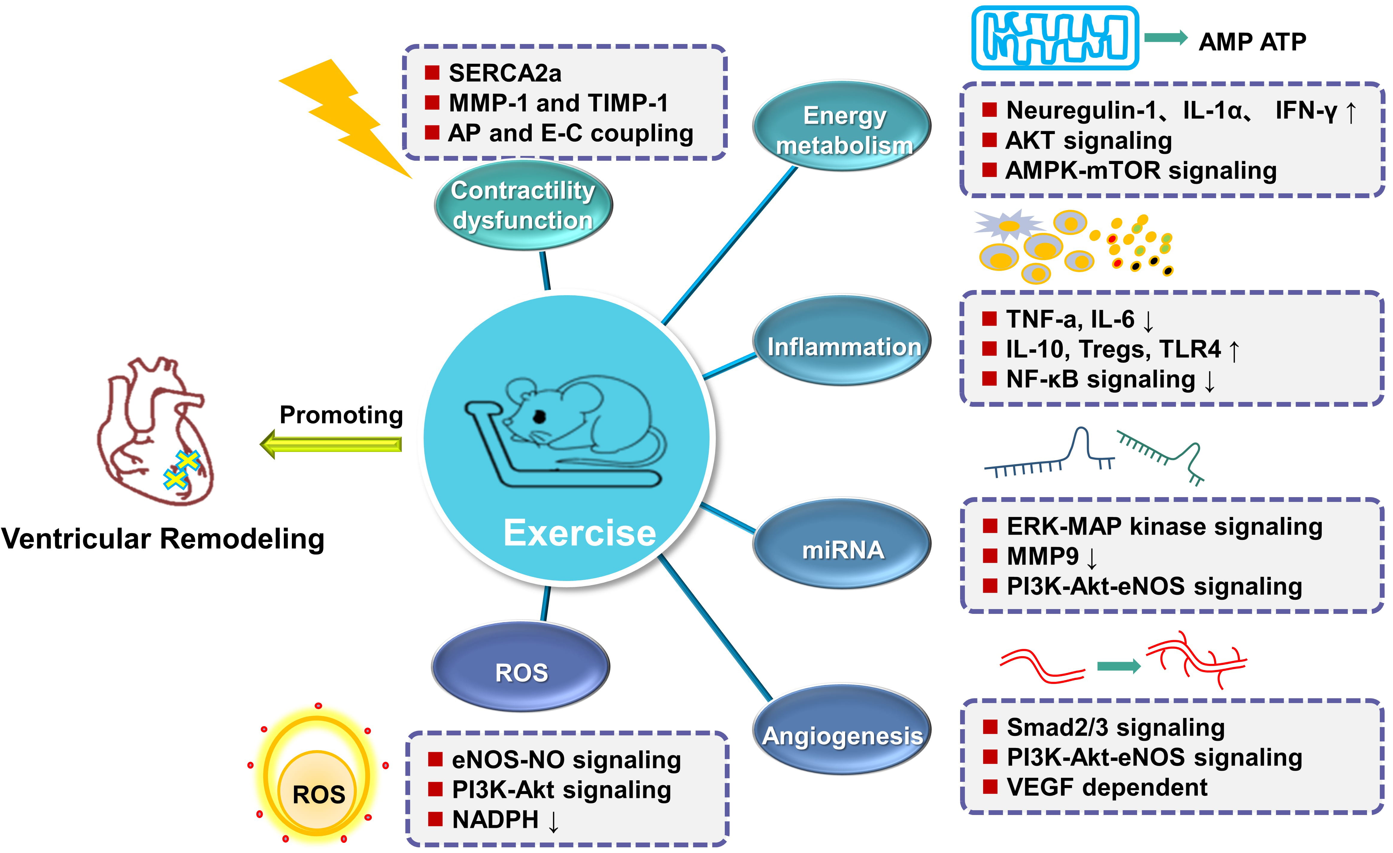 For a long time, exercise training was considered as a significant part in maintaining cardiovascular health. It is reported to be an effective intervention for both primary and secondary prevention of cardiovascular diseases in many clinical studies [12, 13, 14, 15]. Regular exercise training can increase coronary blood flow by improving vasodilatory functions, thereby reducing myocardial oxidative stress, preventing myocardial cell loss and limiting cardiac fibrosis, which in turn reduce the risk of coronary heart disease, myocarditis, myocardial infarction, and other cardiovascular diseases [16, 17].