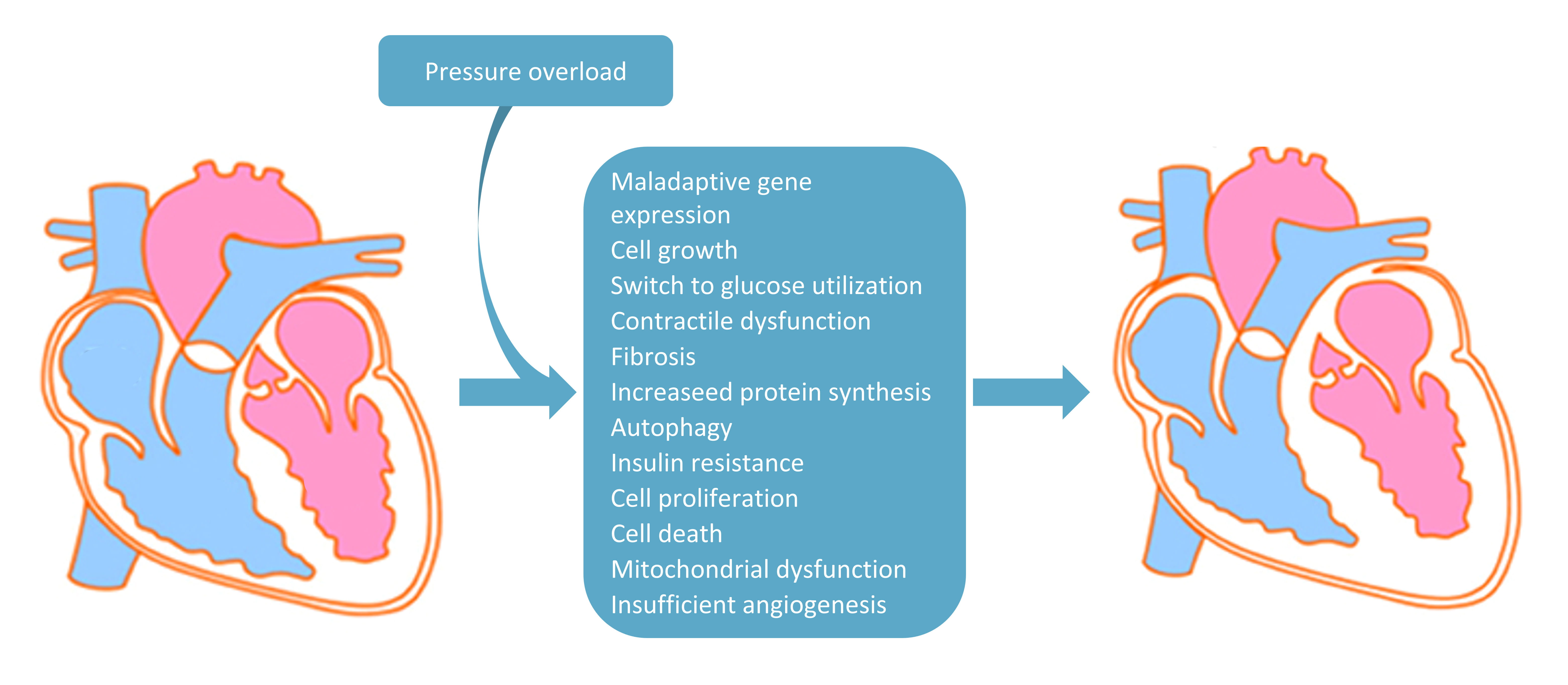 Fig. 1.Main pathophysiological changes due to pressure overload inducing cardiac hypertrophy. In the diagram are listed all the main pressure overload-induced pathophysiological mechanisms involved in the shift from non-hypertrophic (on the left) to hypertrophic heart (on the right).