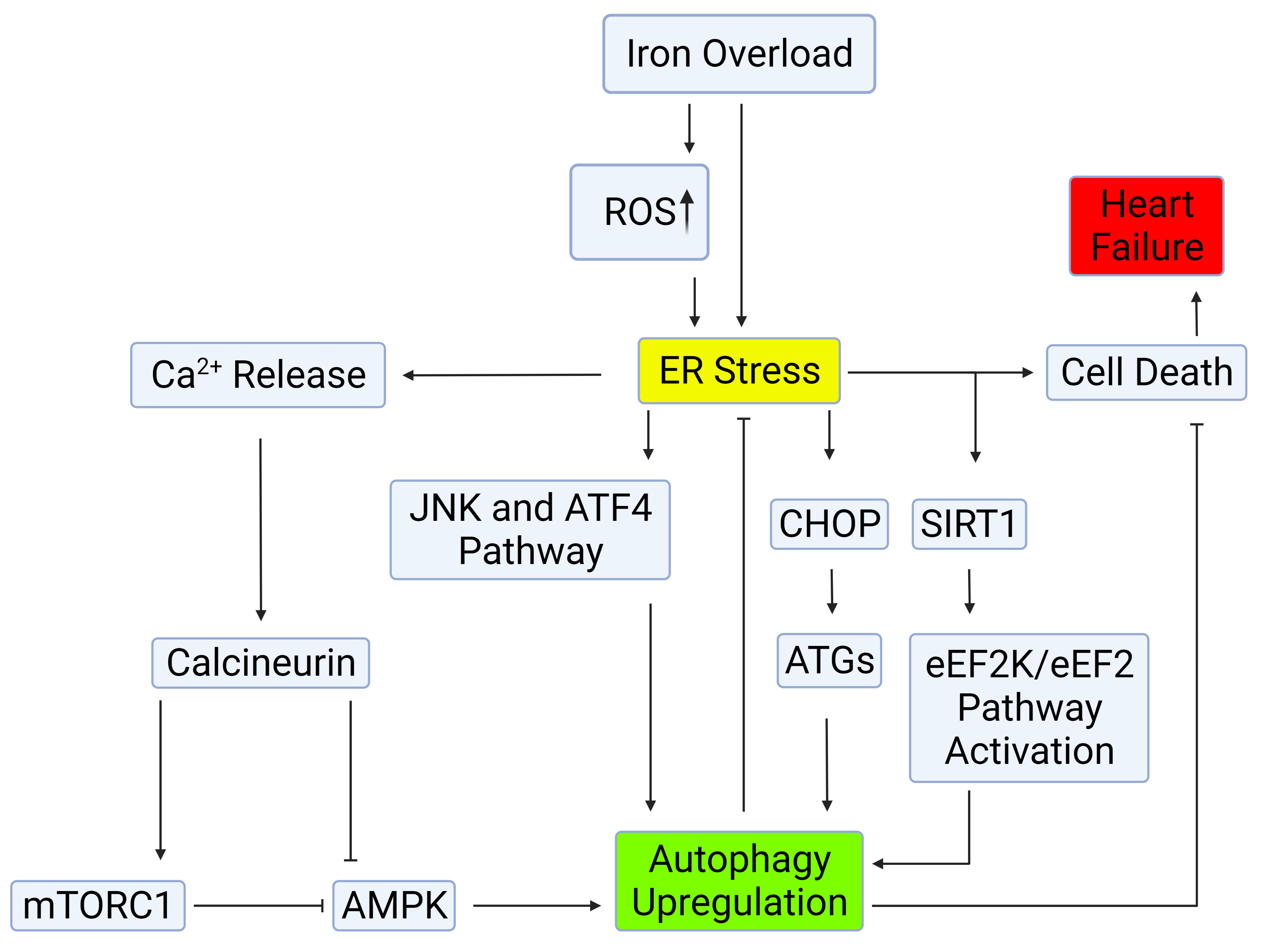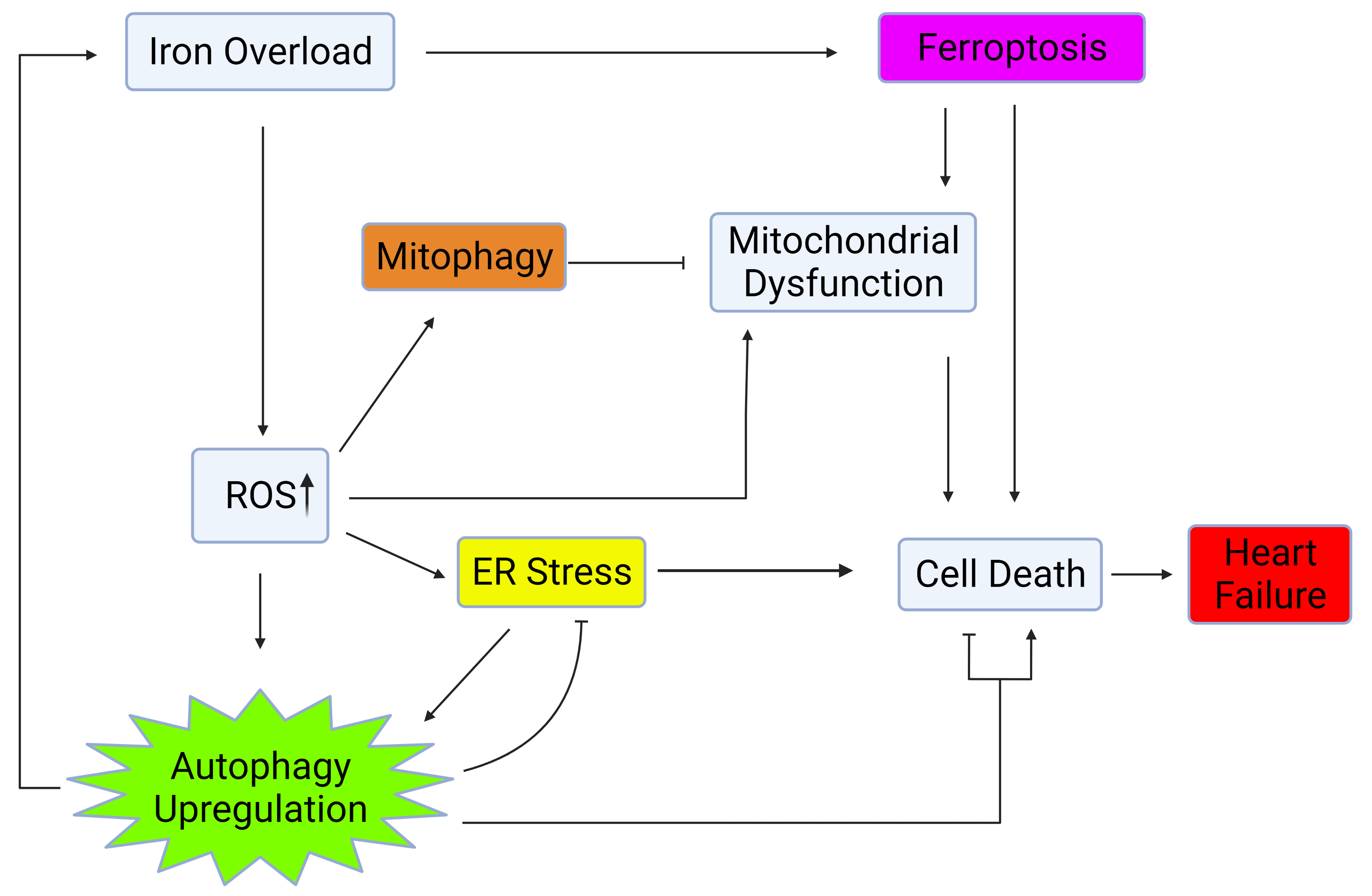 In conclusion, IO causes ferroptosis, mitochondrial dysfunction, oxidative and ER stress. In response to IO, cells upregulate autophagy as a defense mechanism against the deleterious effects of IO. Without adequate upregulation of autophagy, IO causes cell death, ultimately contributing to heart failure. Nevertheless, it should also be borne in mind that an excess of autophagy or oxidative stress, ER stress, mitochondrial dysfunction and ferroptosis pose deleterious effects. Current knowledge of therapeutic targets related to IO, ER stress, ferroptosis, and heart failure were also discussed. We contend that therapeutic strategies targeting multiple cellular processes as discussed in this review may result in more beneficial results.