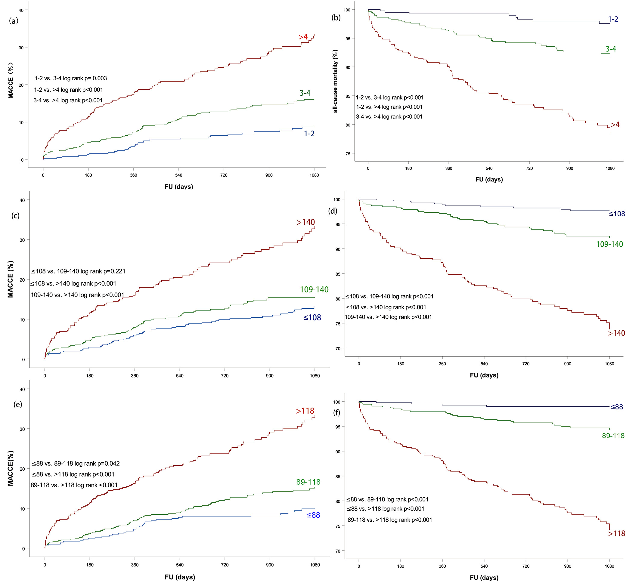 Fig. 2.ROC curves for predicting MACCEs or all-cause mortality during follow-up. Three scores were treated (a) as continuous variables for MACCEs. (b) as categorical variables for MACCEs. (c) as continuous variables for all-cause mortality. (d) as categorical variables for all-cause mortality.