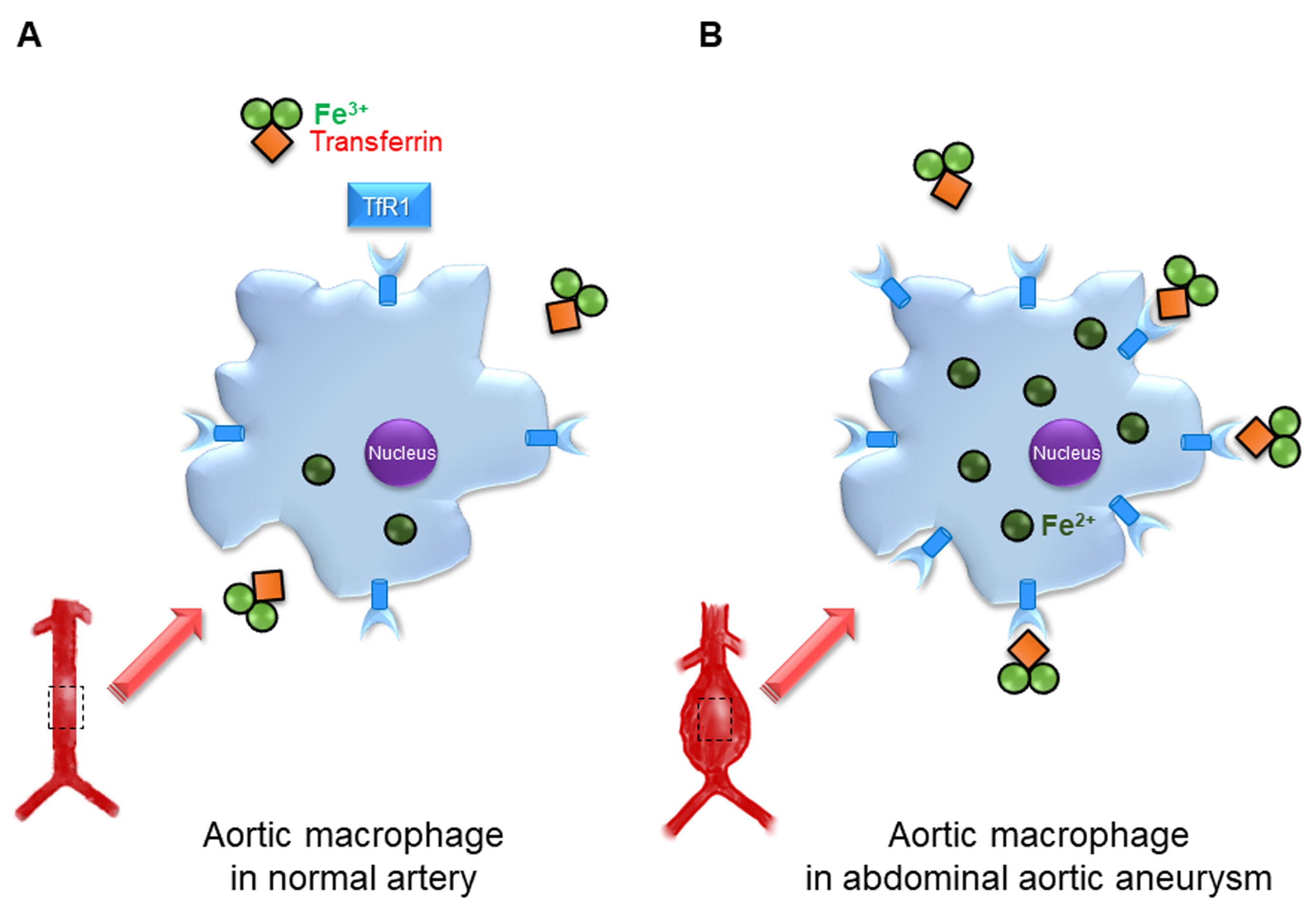 Fig. 2.Transferrin receptor 1 in the pathogenesis of abdominal aortic aneurysm. (A) Transferrin receptor 1 (TfR1) is expressed in aortic macrophages of normal artery. (B) In abdominal aortic aneurysm (AAA) walls, increased TfR1 expression in aortic macrophages induces intracellular iron accumulation, and this may promote AAA progression.