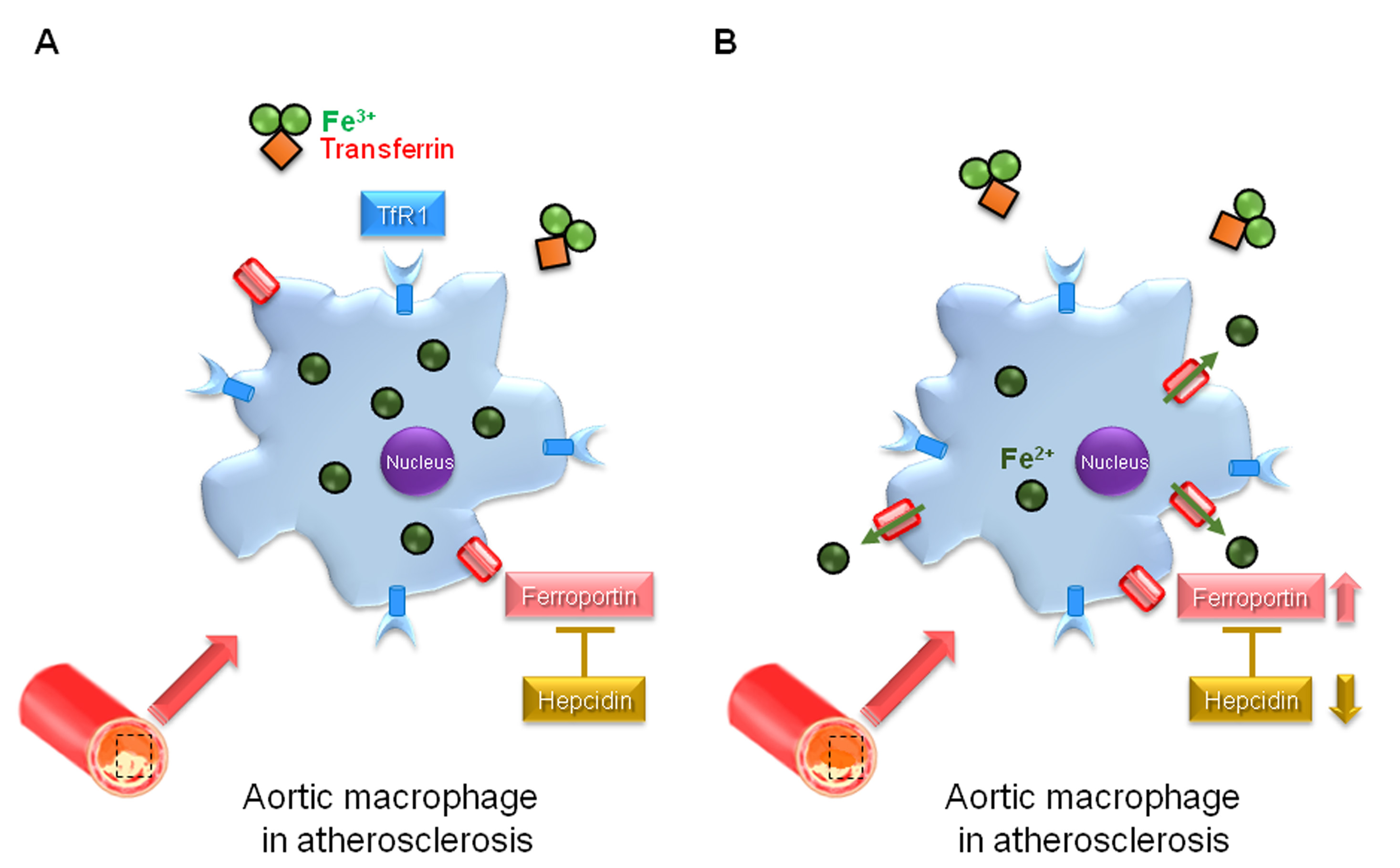 Fig. 3.Hepcidin in the pathogenesis of atherosclerosis. (A) In atherosclerotic lesion, hepcidin suppresses cellular iron export from aortic macrophages with downregulation of ferroportin expression and enhances intracellular iron accumulation, and this may promote atherosclerosis. (B) In hepcidin gene-deficient mice with low-density lipoprotein receptor deficient mice, cellular iron export is induced from aortic macrophages with upregulation of ferroportin expression and decreases intracellular iron accumulation, this may suppress atherosclerosis.