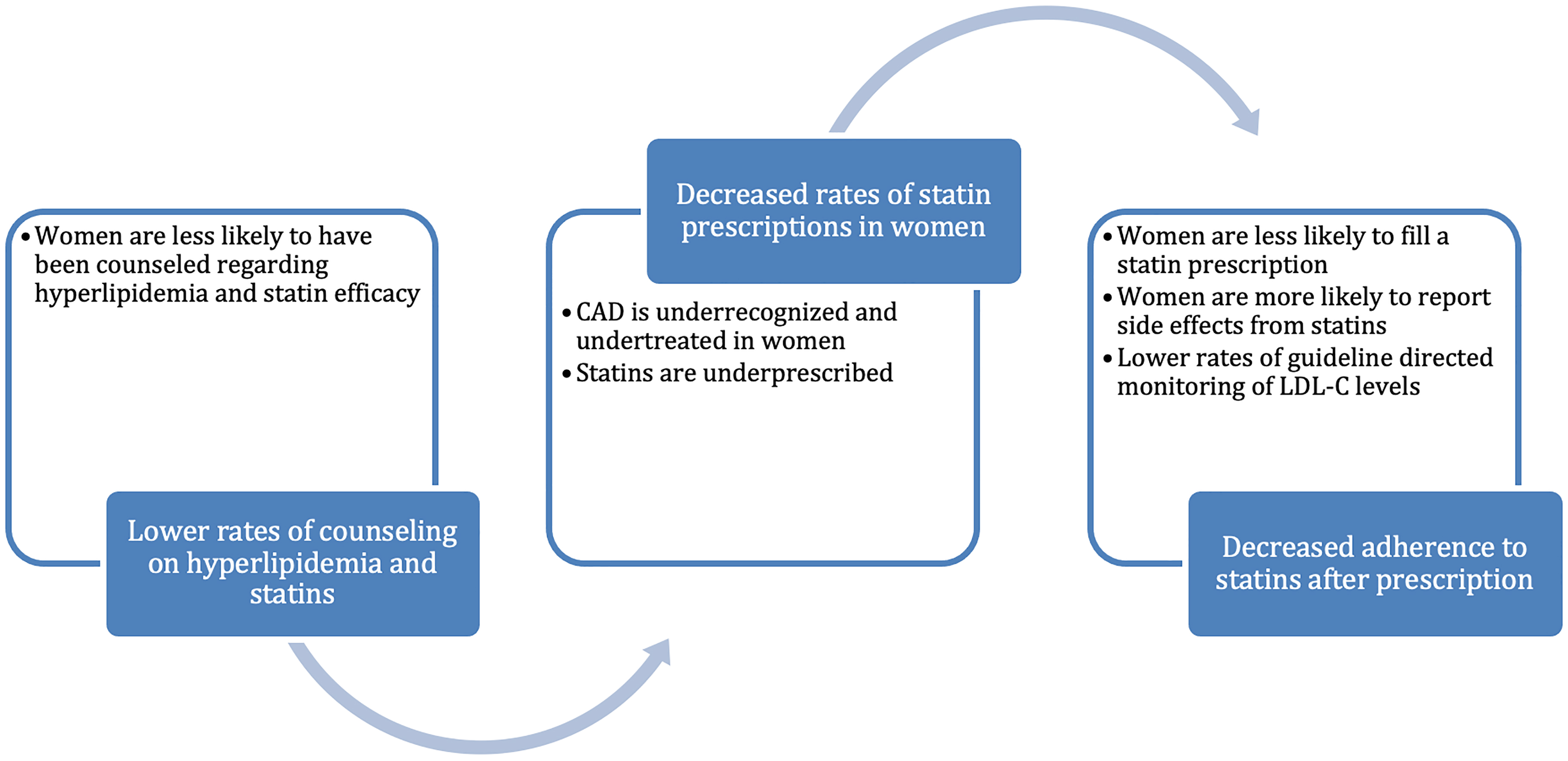 Fig. 2.Causes of decreased statin use and adherence in women. CAD, coronary artery disease; LDL-C, LDL cholesterol.