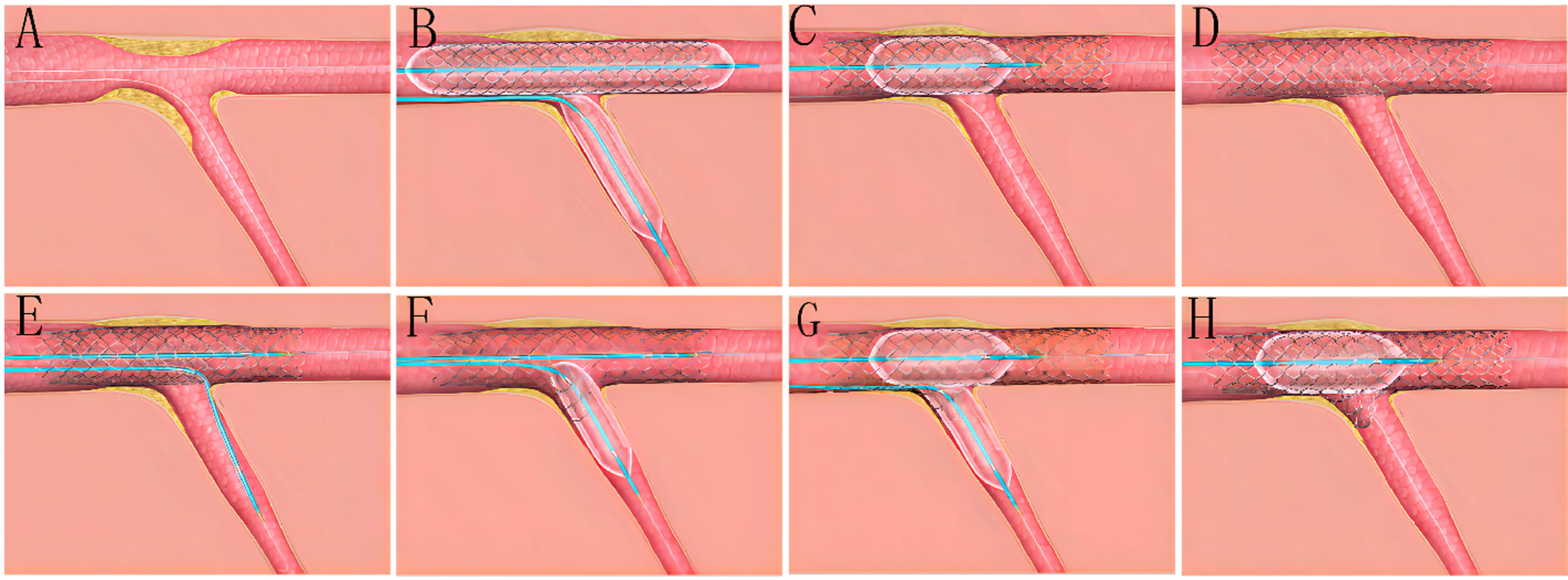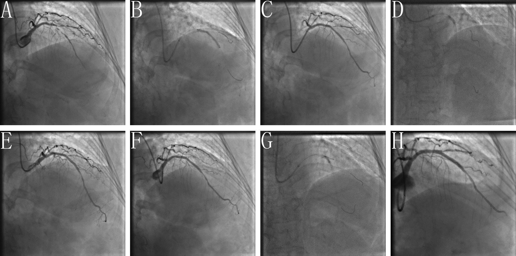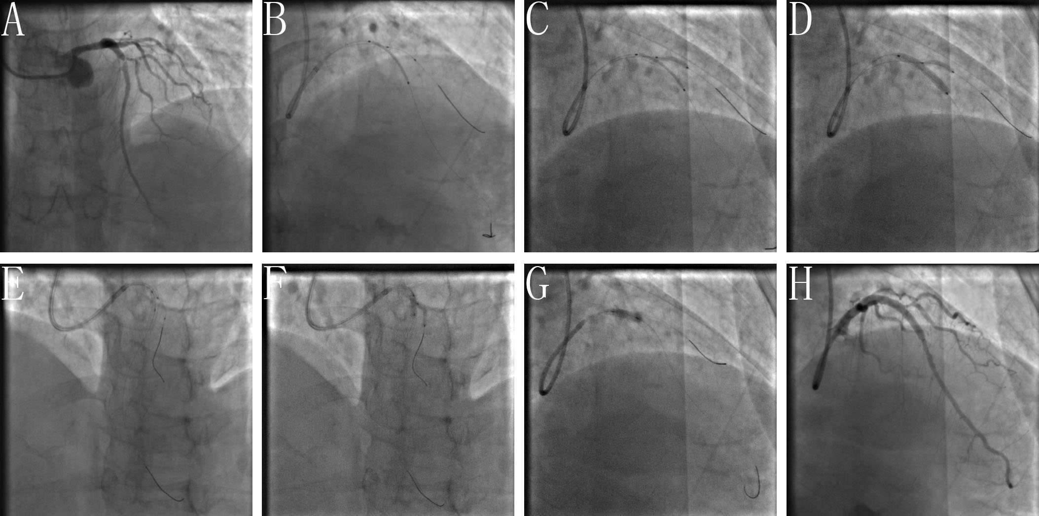 Fig. 2.Clinical practice of the BOOT technique. (A) Baseline angiogram with significant stenosis of the left anterior descending (LAD)/first diagonal bifurcation (D1) (medina classification: 1, 1, 1). (B) SBSD: pre-staying a compliance balloon in the D1 with its proximal maker in the bifurcation core and then properly positioning of the LAD stent. (C) SBSD: First inflating the D1 balloon and then stent balloon, followed by first deflating the stent balloon and then D1 balloon. (D) Snuggling balloon-stent dilation. (E) After rewiring the SB closest to the carina withdraw the pre-imbedding D1 balloon and guidewire, then placing 2 non-compliance balloons with mini-juxtaposition or snuggling-position in the bifurcation core. (F) Sequentially inflating the SB and MB balloons with simultaneous deflation. (G) Finalizing the procedure with (re)-POT. (H) Final angiogram result.