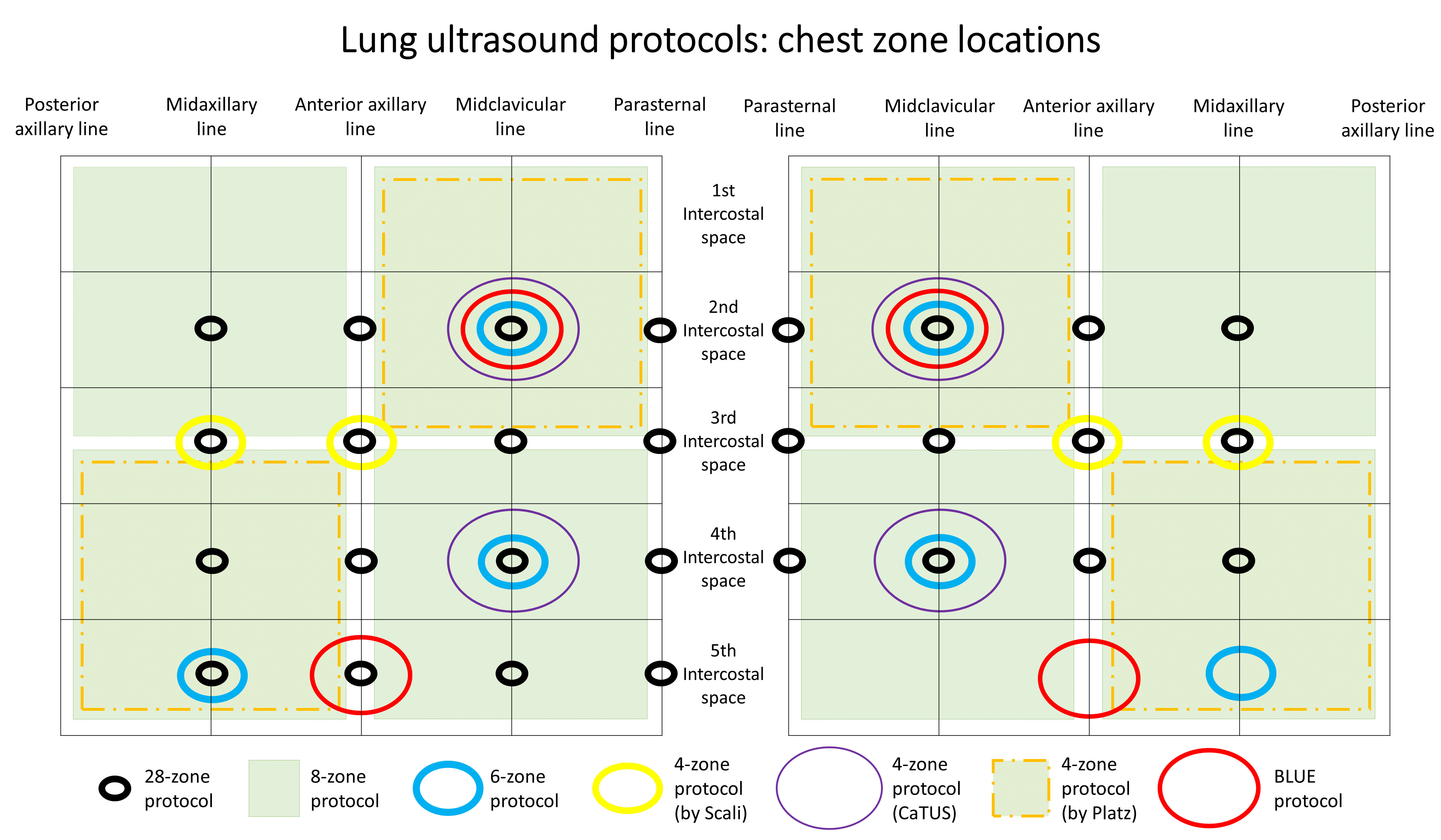 Fig. 1.Chest zone locations with different lung ultrasound methodologies.