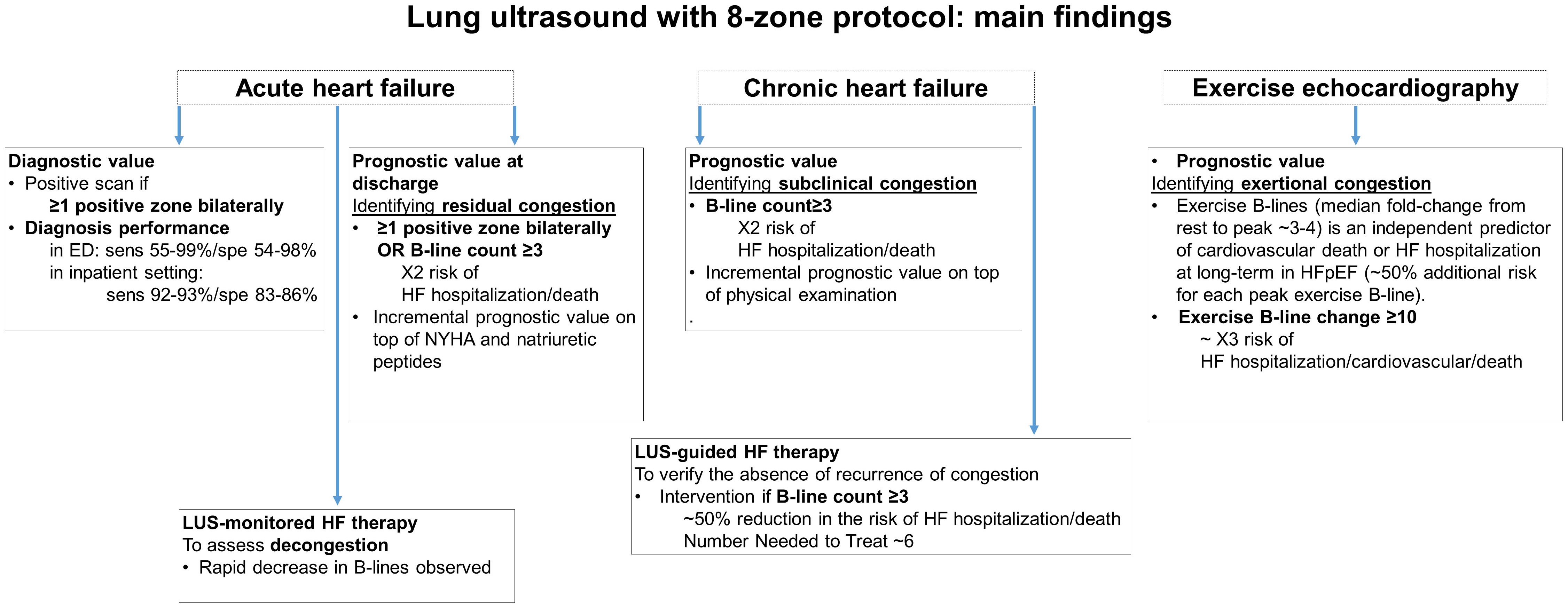 LUS represents a reliable and useful tool for the assessment of pulmonary congestion and risk stratification of HF patients throughout the entire patient journey (i.e., ED/acute settings, in-hospital management, discharge from an acute HF hospitalisation, and monitoring in the outpatient setting), with considerable diagnostic and prognostic implications. The 8-zone protocol appears to offer the best trade-off with no sizeable loss of information.