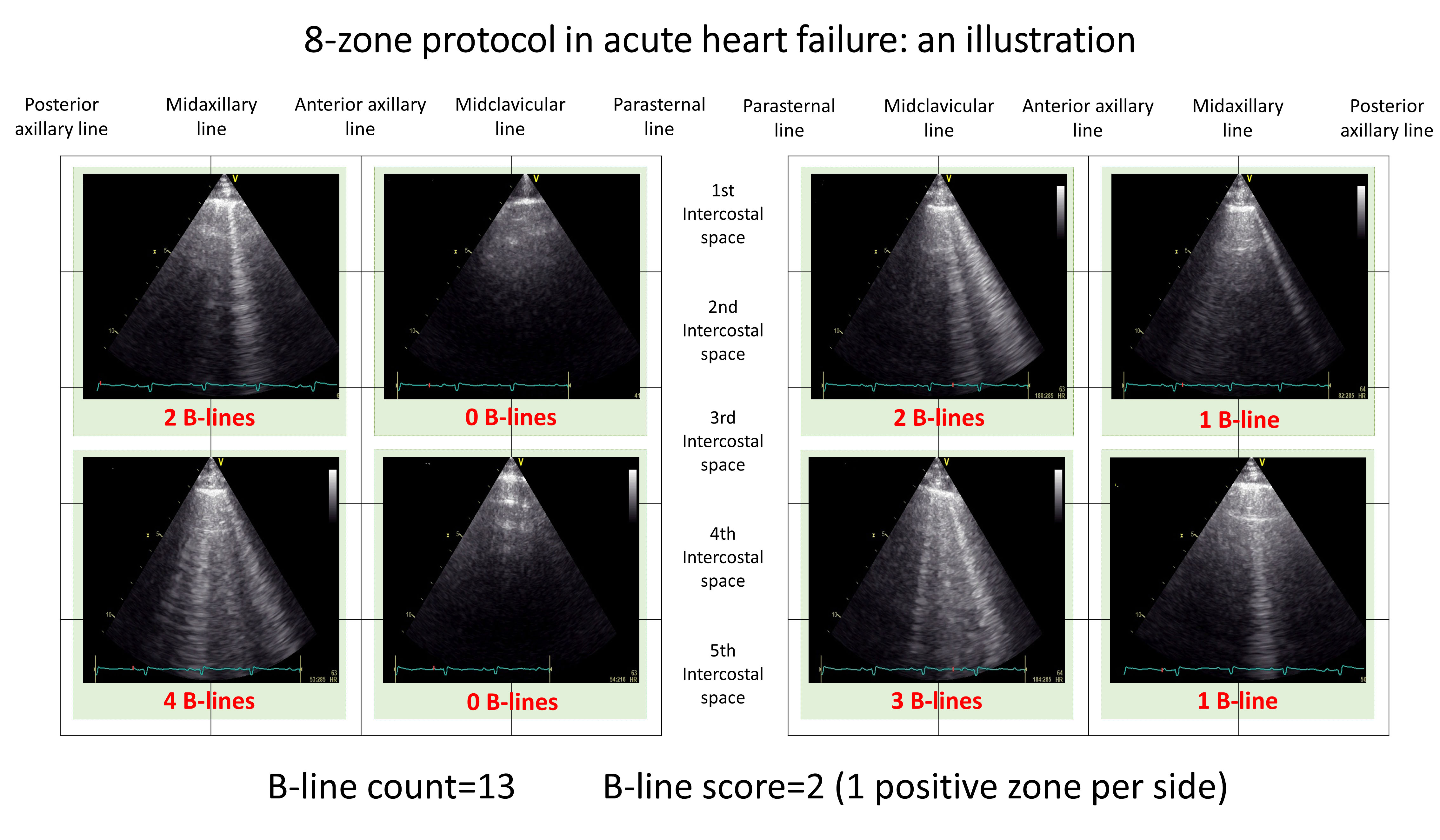 The 8-zone protocol, introduced in 2006 by Volpicelli, represents the most versatile scanning method, largely adopted in both acute and chronic settings [25, 50]. Fig. 2 illustrates main findings with 8-zone protocol in different settings, and Fig. 3 shows an illustration in a patient with AHF. The 8-zone protocol consists of 2 anterior zones (from the sternum to the anterior axillary line, subdivided into upper and lower halves from the clavicle to the second-third intercostal spaces and from the third space to the diaphragm), and 2 lateral zones (from the anterior to the posterior axillary line, subdivided into upper and basal halves) per side. Volpicelli proposed another scanning protocol with 11 zones, 6 on the right side and 5 on the left side [49]. The 6 chest zone protocol was derived from the 8-zone protocol by locating six specific points of intersections on the hemiclavicular and midaxillary line [58].