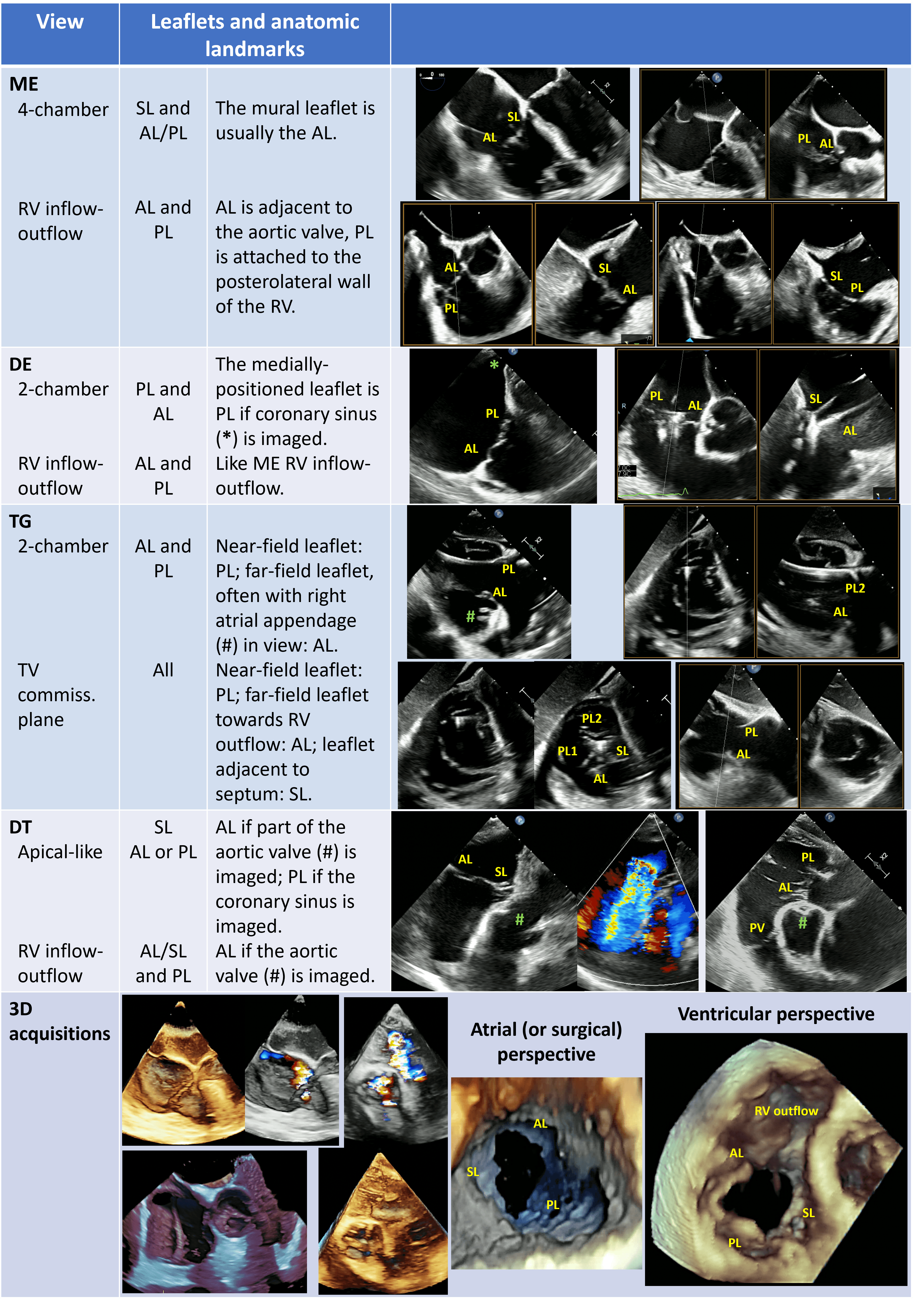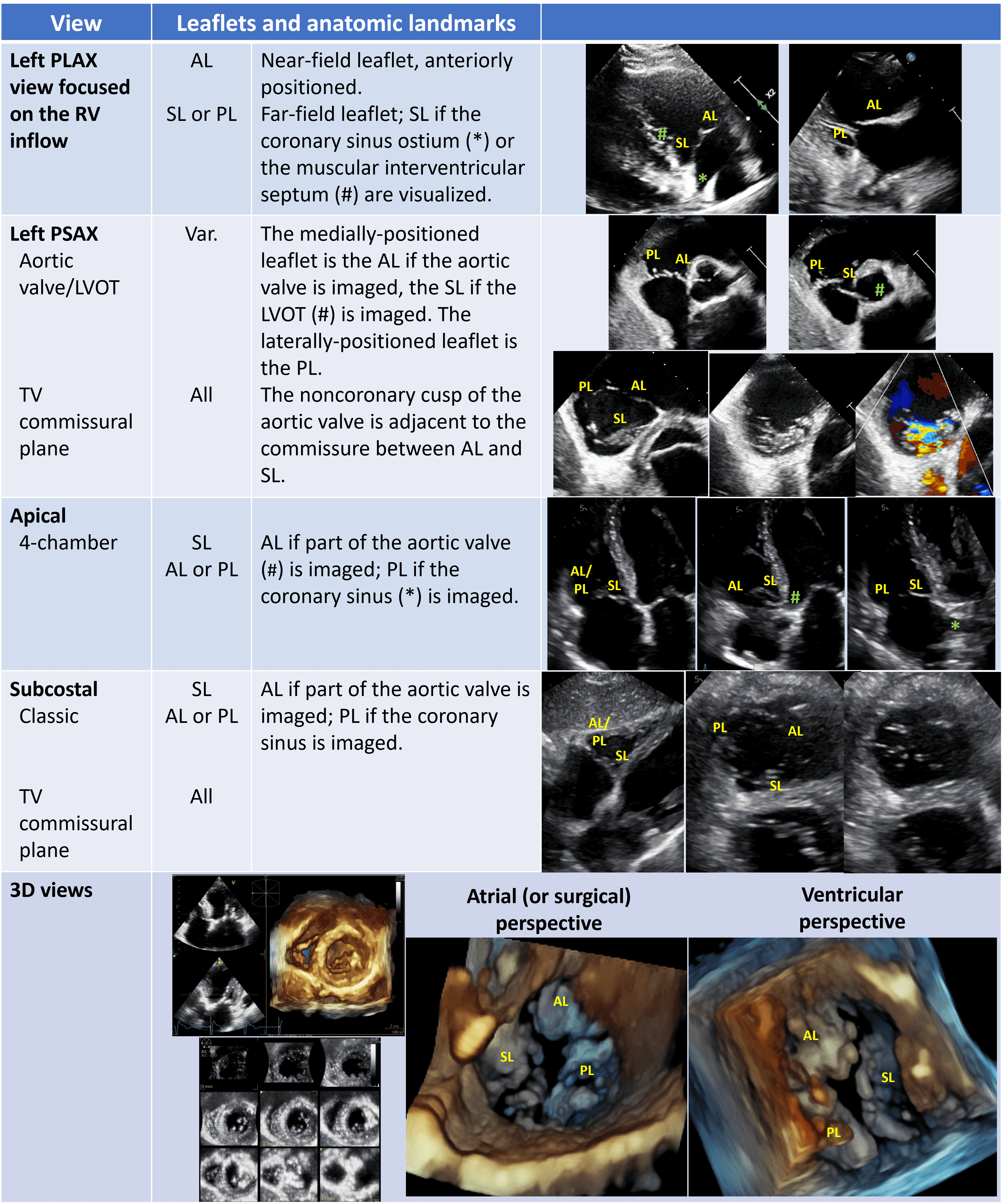 The main TTE views are the left parasternal long-axis (LAX) view focused on the RV inflow, the left parasternal short-axis (SAX), the apical and the subcostal views (Table 1). The visualization of all leaflets in one two-dimensional (2D) view is only rarely achieved, mainly through modified subcostal or parasternal SAX windows. A precise TTE characterization of the leaflets is challenging but few anatomic landmarks may be helpful to guide the imager (Table 1) [2, 36, 37]. The aortic valve permits to localize the anterior leaflet, in particular the non-coronary cusp is adjacent to the antero-septal commissure. The entry point of coronary sinus into the right atrium (RA) locates the postero-septal commissure, instead.
