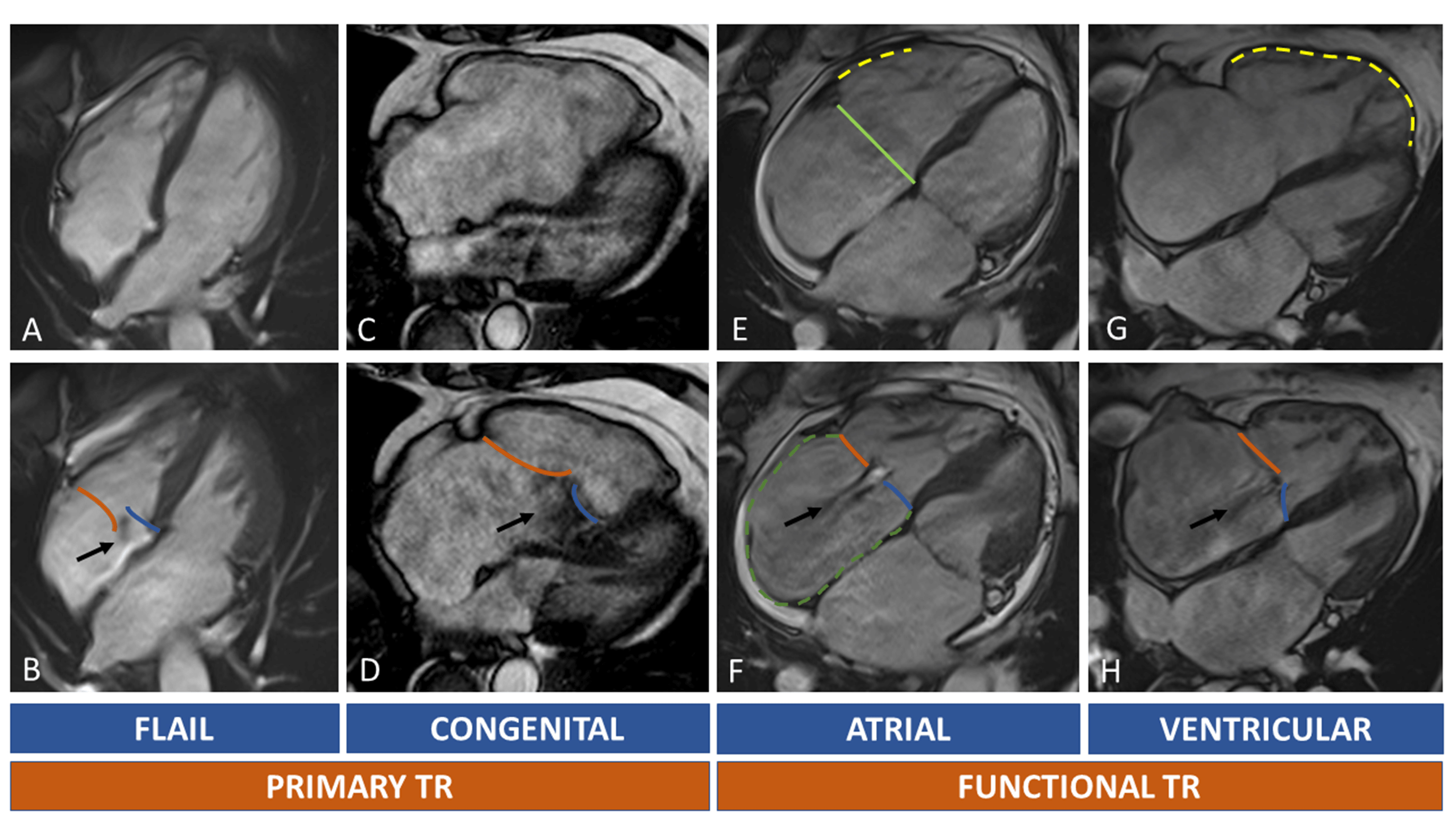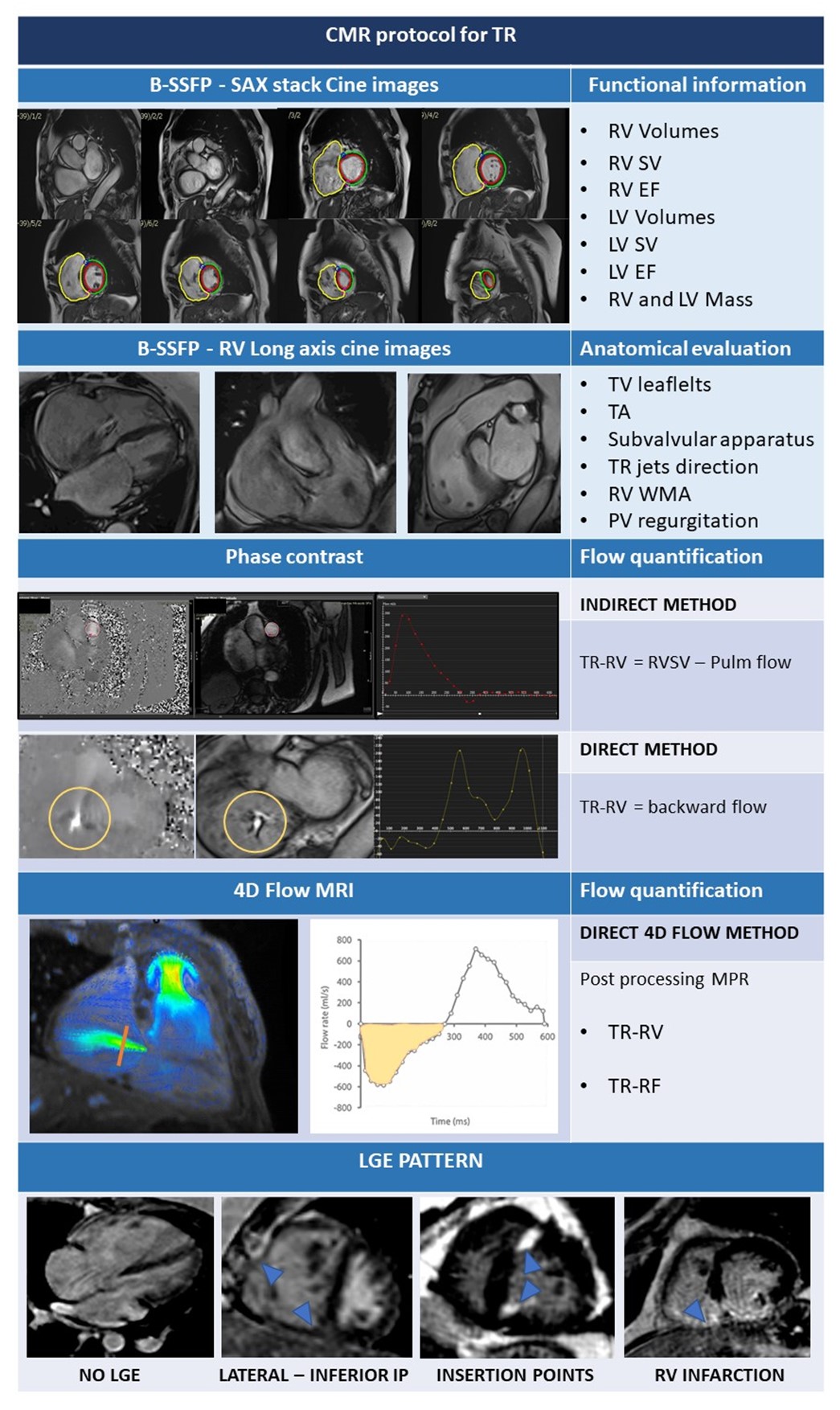 In patients with TR the main goals of CMR are: assessment of right ventricular volume and function, TR grading, anatomical evaluation of venous systemic and pulmonary returns and, finally, tissue characterization. Detailed anatomical study of TV leaflets and mechanism of TR can be done in case of inconclusive echocardiographic studies.