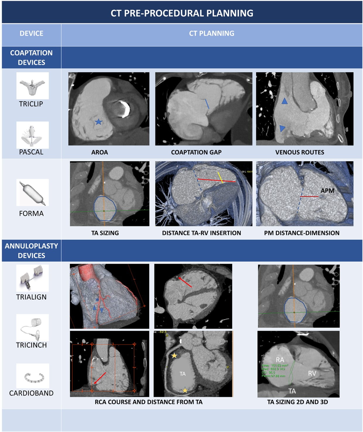 CT scan is pivotal for the pre-procedural planning of TTVI. Transcatheter tricuspid devices can be categorized as: coaptation devices, annuloplasty devices, heterotopic valves, orthotopic prostheses (Table 7A,7B).