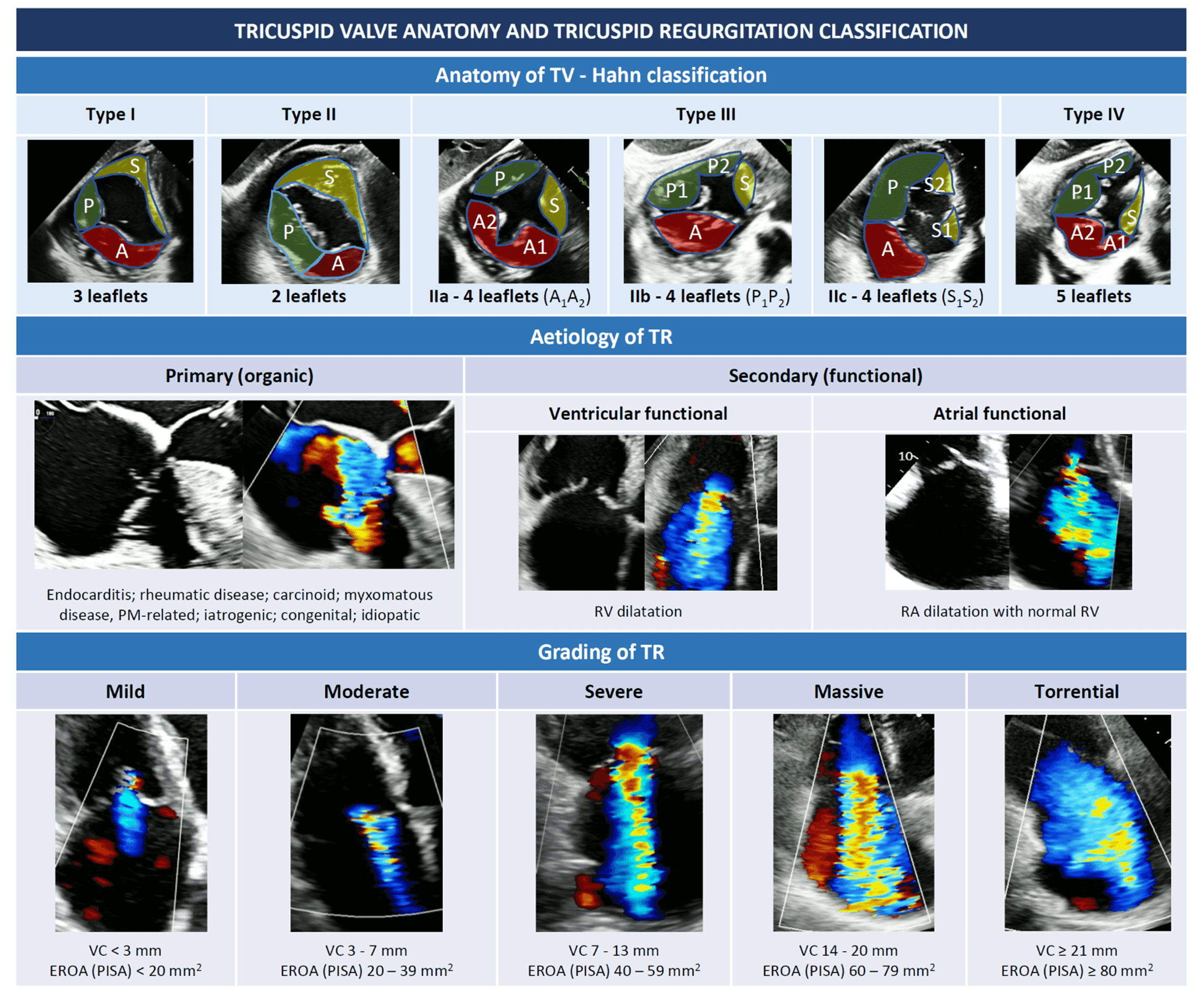 Fig. 1.Tricuspid valve anatomy and tricuspid regurgitation classification (see introduction). Abbreviations: EROA, effective regurgitant orifice area; PISA, proximal isovelocity surface area; PM, pace maker; RA, right atrium; RV, right ventricle; TR, tricuspid regurgitation; TV, tricuspid valve; VC, vena contracta.