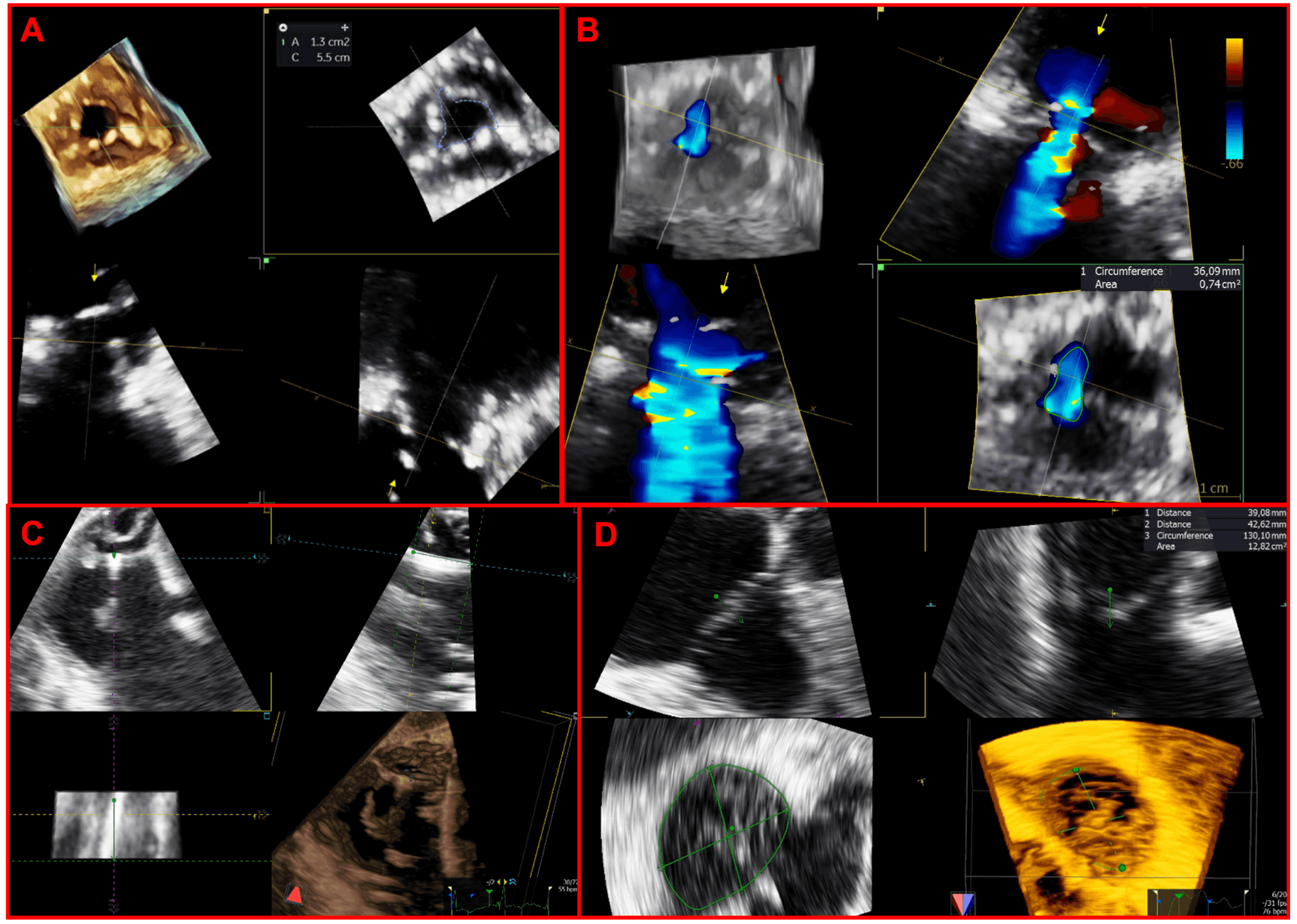 Fig. 2.Applications of multiplanar reconstructions of 3D datasets of the tricuspid valve. (A) 3D multiplanar reconstruction of a stenotic tricuspid bioprosthetic valve, used to planimeter the residual bioprosthetic orifice area. (B) Multiplanar reconstruction of a 3D color-Doppler volume dataset for quantification of regurgitant vena contracta area. (C) 3D multiplanar reconstruction used to assess the transvalvular trajectory of a CIED-lead during the entire cardiac cycle and its relationships with leaflets and the subvalvular apparatus. (D) 3D multiplanar reconstruction used to planimeter the annular perimeter, area and diameters.