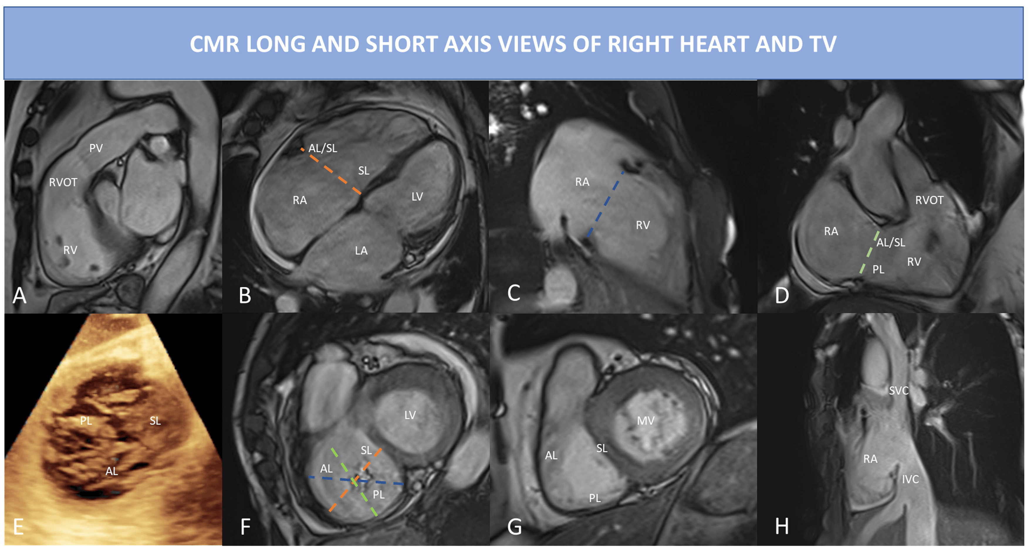 Fig. 3.CMR long and short axis view of right heart and TV using bSSFP sequences. (A) RVOT view: in this view can be best appreciated pulmonary valve regurgitation and outflow tract. (B) 4 Chamber view: right ventricular inflow, RV and RA are visualized; the dotted orange line indicates the septo-lateral dimension of the TA. (C) RV 2 chamber view or inflow view, only the RA and RV are visualized; the dotted blue line represents the TA. (D) RV inflow/outflow view also called RV 3 chamber view, the dotted light green line shows the antero-posterior dimension of the TA. (E) 3D echocardiography of the TV showing a central coaptation defect in this case of functional TR; all three leaflets are visualized. (F) CMR short-axis systolic view of the TV of the same case of (E): the dotted lines represent the different TA dimension as depicted in (B–D) (but acquired in diastolic phase to measure the largest TA diameters). (G) CMR short-axis diastolic view of TV, the three leaflets are easily identified. (H) bicaval righ atrial view, prescribed using a cutting plane passing through the RA, the IVC and the SVC; in this view both IVC and SVC dimensions can be assessed, the HV is also visualized. Abbreviations: AL, anterior leaflet; b-SSFP, balanced steady state free precession; CMR, cardiac magnetic resonance; HV, hepatic vein; MV, mitral valve; IVC, inferior vena cava; LA, left atrium; LV, left ventricle; PL, posterior leaflet; PV, pulmonary valve; RA, right atrium; RV, Right ventricle; RVOT, right ventricular outflow tract; SL, septal leaflet; SVC, superior vena cava; TA, tricuspid annulus; TV, tricuspid valve.