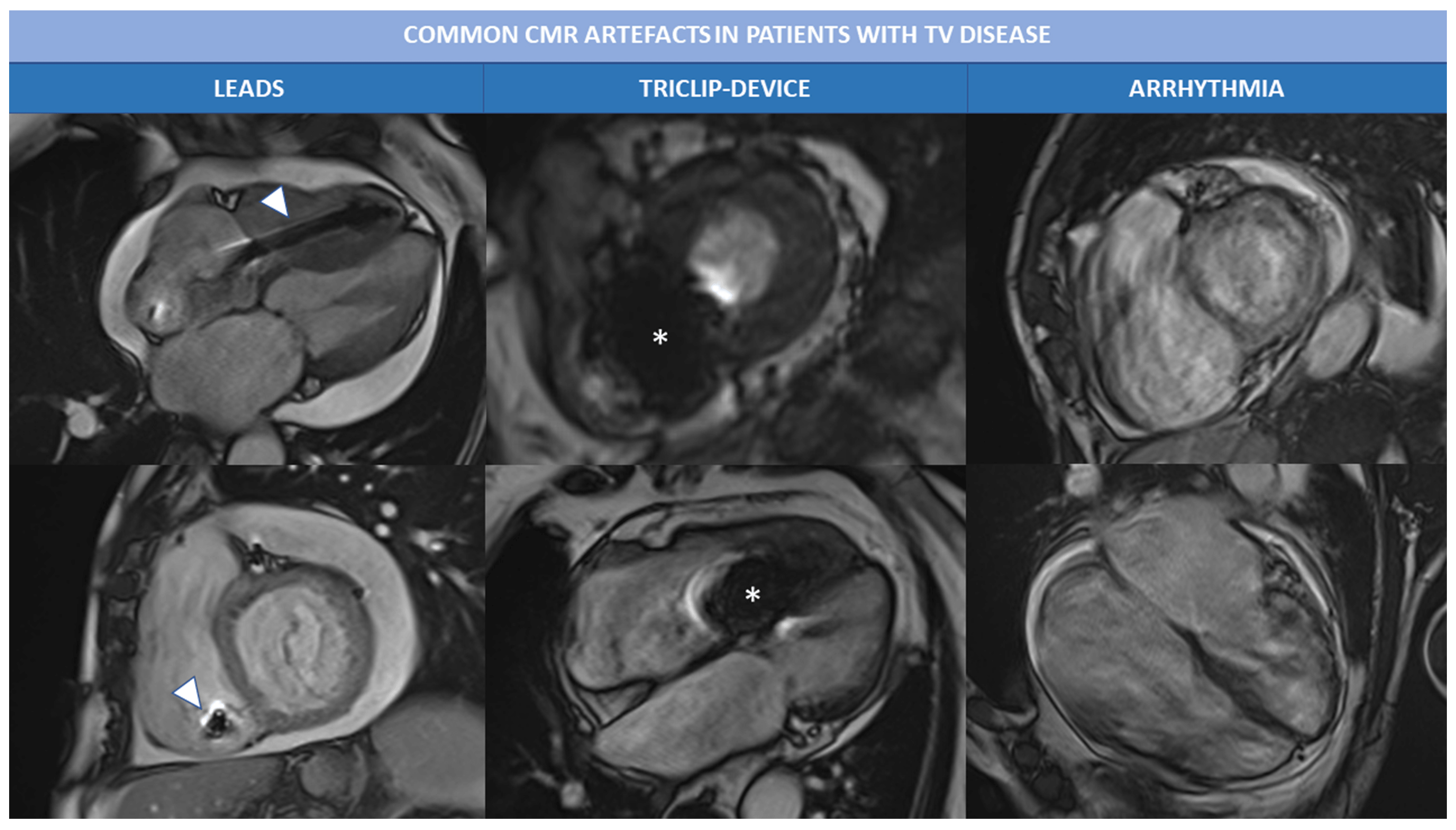 Fig. 4.Common CMR artefacts in patients with TV disease. Magnetic susceptibility and metallic artefacts are frequent in patients with TR; they are caused by the presence of ferromagnetic components of PM leads (arrowheads) or triclip device (*) and can affect image quality. Arrhythmias, like atrial fibrillation is often associated with severe TR and can cause motion artefacts, as shown in the right column. Abbreviations: CMR, cardiac magnetic resonance; PM, pace maker; TR, tricuspid regurgitation; TV, tricuspid valve.