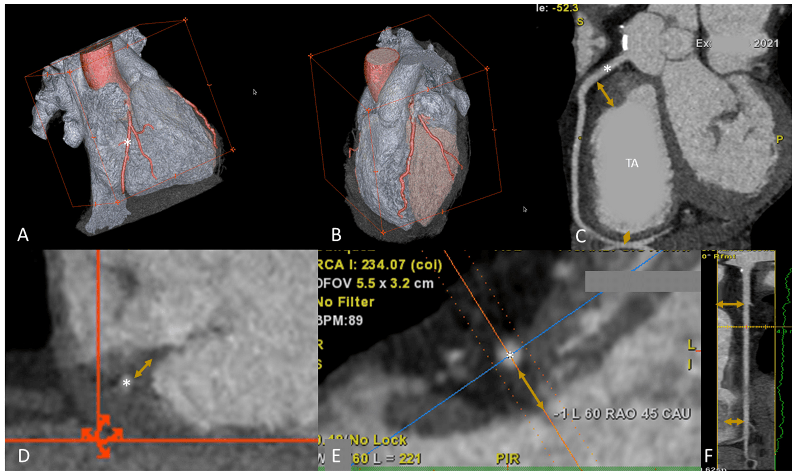 Fig. 7.Right coronary artery evaluation prior to TVI. With adequate patient preparation and a dedicated triphasic protocol it is possible to evaluate RCA and RH at the same time. (A,B) 3D volume rendering of both right and left chambers; the coronary arteries are highlighted in red, the RCA (*) has a normal course in the AV groove. (C) Relationship between RCA (*) and TA. Distance between proximal and distal RCA (yellow arrows) can be calculated. Proximal or distal RCA of 2 mm, may be associated with high risk of RCA impingement during TV annuloplasty. (D,E) Distance between RCA and TA in LAX views. In (D) the course of RCA is into the AV groove, while in (E) the RCA course is superior the TA. In (F), multiplanar reconstruction algorithm of RCA is shown; the distance between the RCA and the annulus is indicated with orange arrows. Abbreviations: AV, atrioventricular; LAX, long axis; MPR, multiplanar reconstruction; RCA, right coronary artery; RH, right heart; SAX, short axis; TA, tricuspid annulus; TV, tricuspid valve; TVI, tricuspid valve intervention.