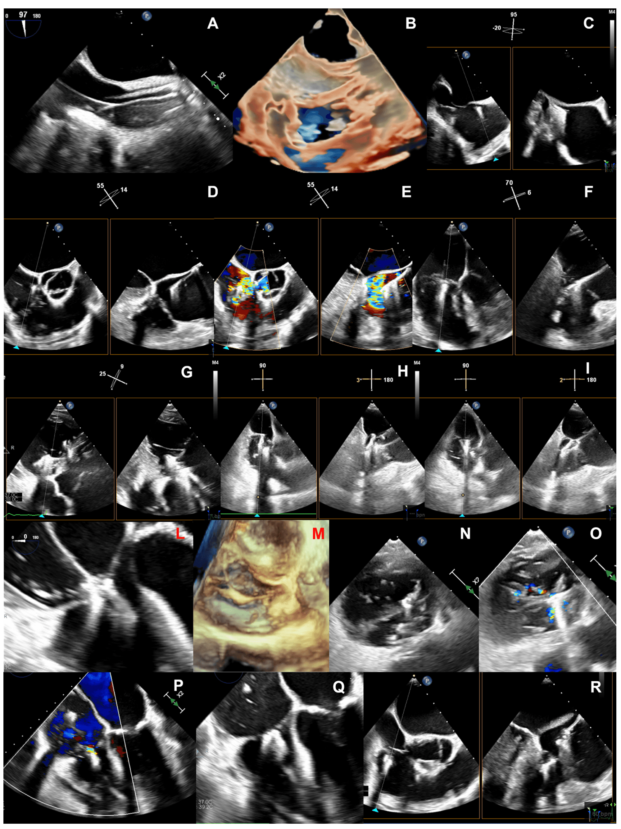Fig. 8.Steps of intraprocedural imaging. (A,B) Insertion of the steerable guide catheter into the right atrium. (C–E) Advancement of the clip delivery system through the steerable guide catheter into the right atrium and steering towards tricuspid valve plane. (F) Axial alignment of the clip delivery system. (G) Clip rotation and alignment to the coaptation line. (H,I) Leaflet grasping. (L–N) Check of adequate leaflet tissue grasping. (O,P) Assessment of residual TR. (Q) Clip deployment. (R) advancement of a second clip into the right atrium.