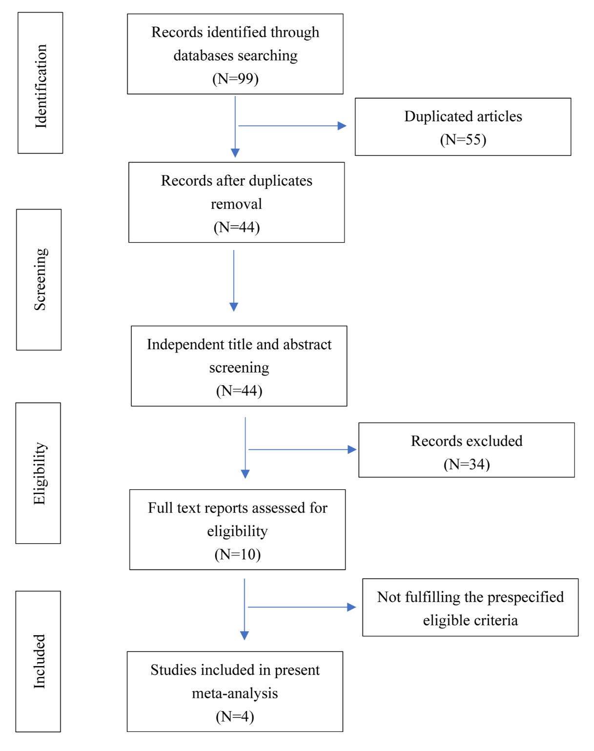 A total of 99 studies were initially identified, among which, 44 articles were screened after removing duplicates. Finally, 4 studies were included in the present meta-analysis, including three RCTs and one observation cohort study. The general characteristics of the included trials are presented in Table 1 [7, 8, 10, 11].