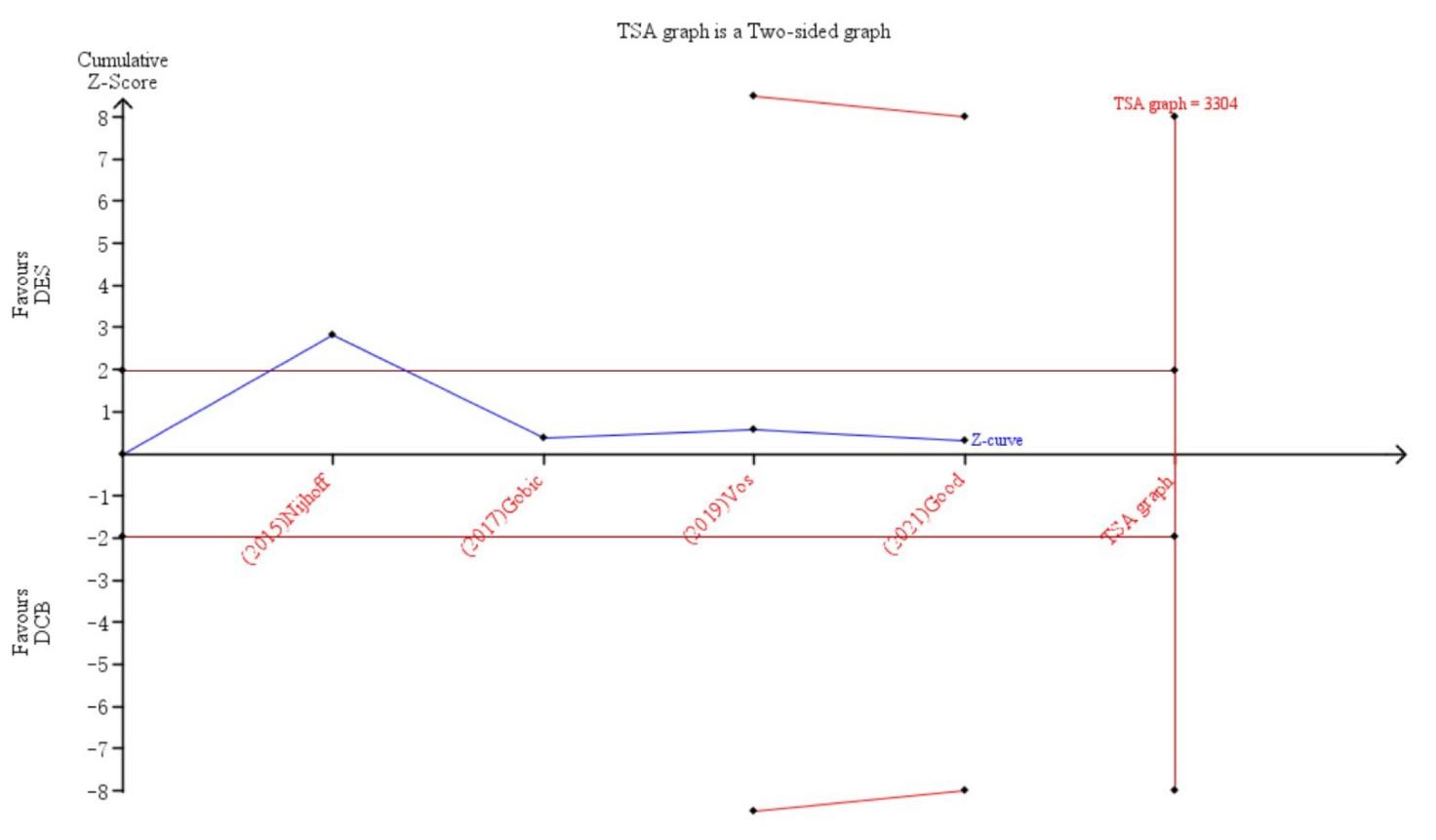 TSA (Fig. 10) was performed to estimate the power of the conclusion derived from the four included trials. Predefining type 1 error as 5%, power as 80%, relative risk reduction as 30%, the required sample size was 3304 which meant that the current sample size was not large enough to fully confirm the conclusions. Although DCB was inferior to DES in terms of TLR based on these four trials, this result may represent a false negative conclusion.