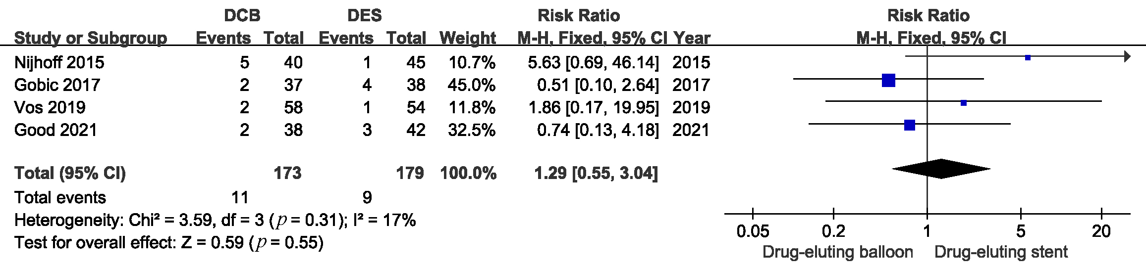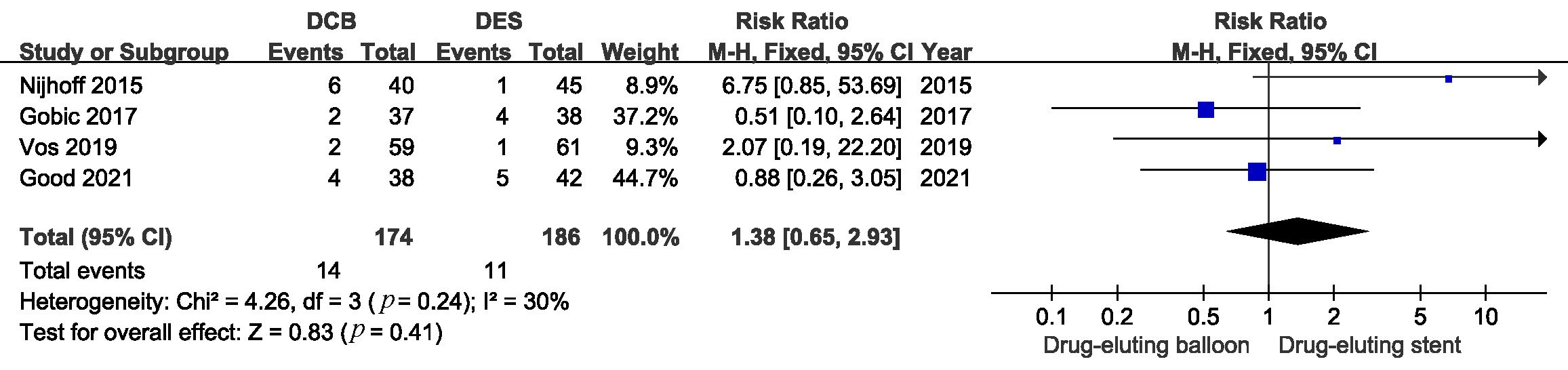 Fig. 5.Comparison of the risk of myocardial infarction between DCB and DES. DCB, drug-coated balloons; DES, drug-eluting stents.
