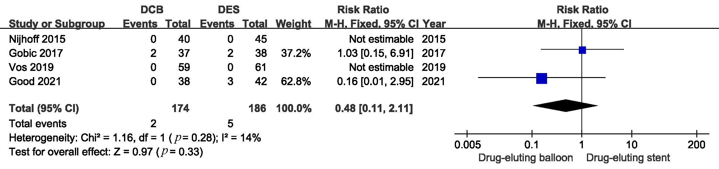 There were similar risks of myocardial infarction and all causes of death between the DCB and DES groups. (Figs. 5,6. MI: RR 0.48, 95% CI: 0.11 to 2.11, p = 0.33; Death: RR 1.55, 95% CI: 0.32 to 7.62, p = 0.59).