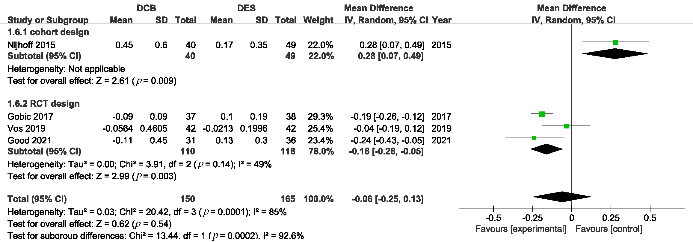 Subgroup analysis based on the study design revealed that LLL was significantly lower in the DCB group in RCTs (Fig. 9. MD –0.16, 95% CI: –0.26 to –0.05, p = 0.003).