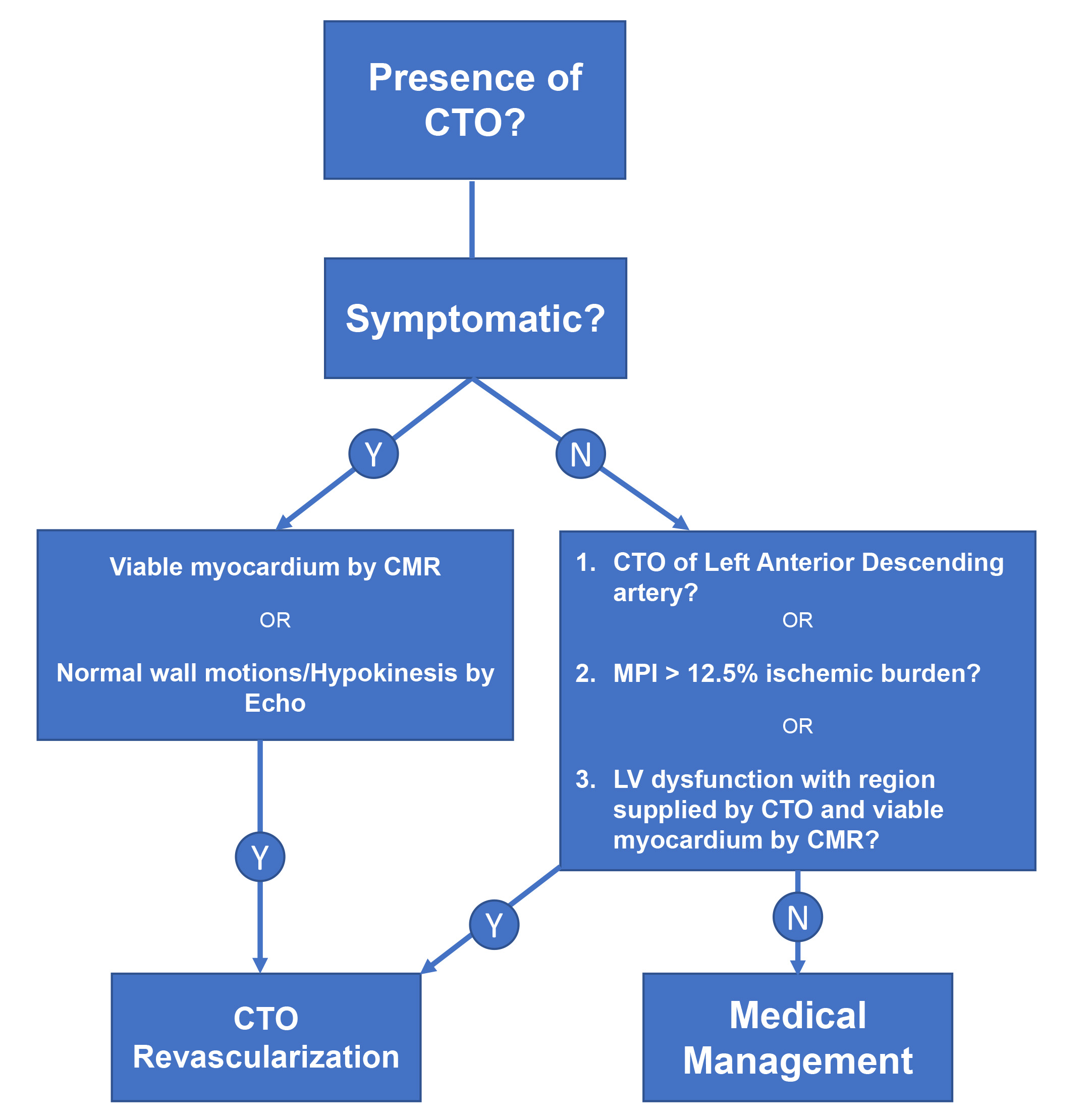 This literature raises some important questions for management of CTO. The first clinical question is whether revascularization improves clinical outcomes. The EXPLORE trial suggested that it may be beneficial in those with CTO to LAD. The DECISION-CTO and REVASC trials attempted to answer these questions and while neither achieved their primary outcome there is still room for skepticism. The DECISION-CTO trial was underpowered and had a high rate of cross-over. The REVASC trial had limitations because despite its randomization there were differences in the two arms. For instance in the non-CTO revascularization arm there were much higher rates of PCI in coexisting non-CTO segments, particularly in segments that provide collateral blood supply, as study protocol allowed for additional PCI at the time of index diagnostic angiography. Additionally, the study included predominantly healthy ventricles and intervention of CTO segments that do not supply the left ventricle thus any intervention is not expected to have much effect on LVEF.