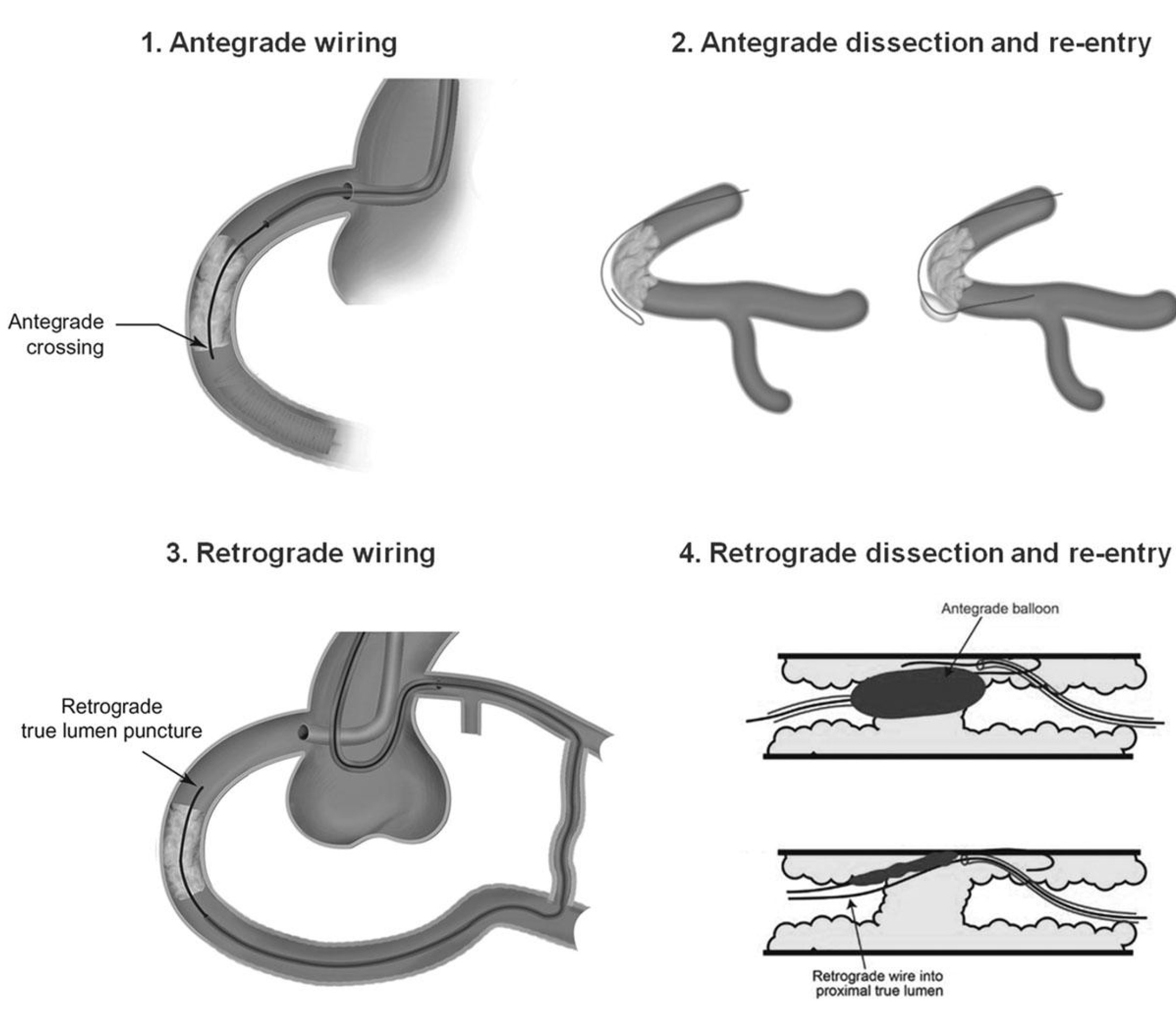 Fig. 2.CTO Wiring Techniques. Reproduced with permission from Brilakis et al. [30]. Copyright © 2019, Wolters Kluwer Health, Inc. Antegrade: In the antegrade approach, wires of escalating stiffness are used to cross a CTO. Retrograde: In the retrograde approach, the CTO is approached from the distal vessel by advancing a guidewire into the artery distal to the occlusion through a collateral vessel or bypass graft. Antegrade Dissection & Re-entry: In the antegrade dissection and re-entry approach, the CTO is approach via the subintimal space followed by re-entry into the true limen distal to the CTO using guidewires or balloon systems. Reverse Dissection & Re-entry: In the reverse dissection and re-entry approach the crossing is aided by an angioplasty balloon from the antegrade direction to help make a connection between the two spaces.
