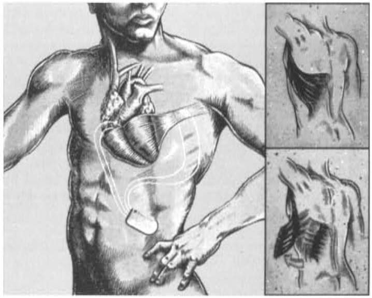 Dynamic cardiomyoplasty mimicked the effects of mechanical ventricular assistance by using autologous muscle to surround and contract the heart (Fig. 3) [33, 34]. In this approach, the patient’s latissimus dorsi was first electrically stimulated and “trained” to become fatigue resistant by using a pacemaker capable of producing the train of electrical impulses necessary for skeletal muscle contraction. In a subsequent operation, the latissimus dorsi was disconnected from its insertion, translocated to encircle the heart, and then stimulated to contract in synchrony with it [33]. In experimental animal models of dynamic cardiomyoplasty, the expected alterations in systemic arterial pressure were produced [34]. In a prospective randomized study in humans, dynamic cardiomyoplasty improved New York Heart Association (NYHA) class in the experimental arm but had not objectively improved cardiac performance parameters at 12 months or conferred a survival advantage when compared with controls [35]. Dynamic cardiomyoplasty did prevent progressive left ventricular dilation, which may have accounted for the overall improvements in NYHA classification and quality of life. The latissimus dorsi’s “girdling” effect during diastole was postulated to be as important as active muscle contraction during systole.