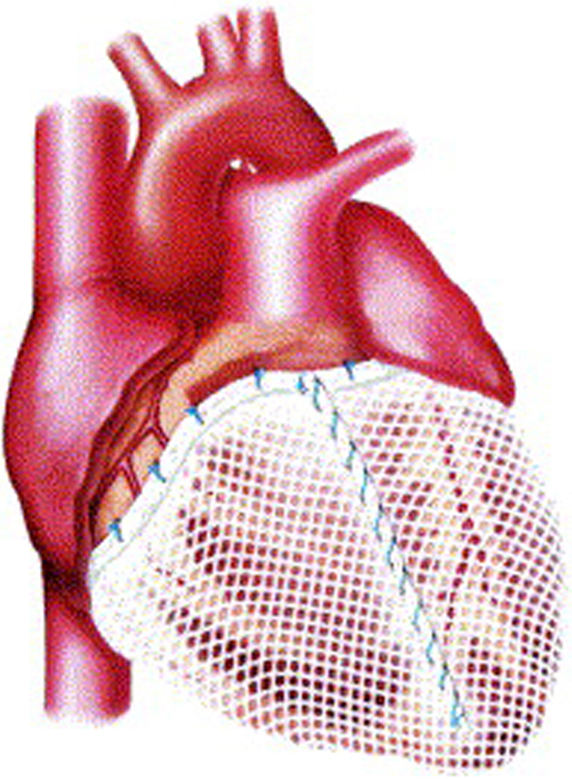 Other prosthetic devices were developed to reproduce the girdling effect seen in dynamic cardiomyoplasty. The Acorn CorCap cardiac support device (Acorn Cardiovascular, St Paul, MN, USA) was a passive-support synthetic mesh wrap that encircled the right and left ventricles. Constructed of preformed polyester polymer, the CorCap was inserted via a thoracotomy and was anchored to the atrioventricular groove with stay sutures to fit snugly about the heart (Fig. 4) [36]. In animals with induced left ventricular dilation and heart failure, application of the CorCap device improved hemodynamics and overall cardiac function, including ejection fraction [37, 38]. In a human clinical trial, improvements in left ventricular end-diastolic volume, end-systolic volume, and sphericity were observed, along with better Living with Heart Failure scores [39]. Nonetheless, the device was difficult to apply and did not progress beyond its initial clinical trial.