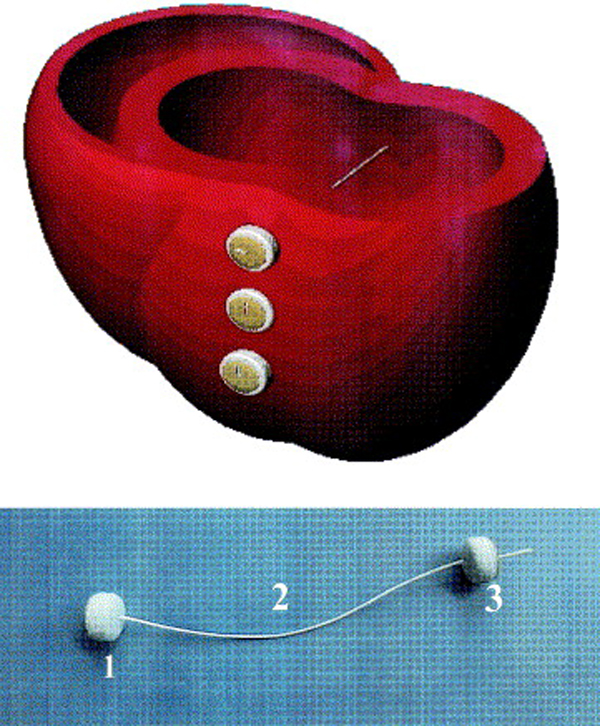 The Myosplint (Myocor, Maple Grove, MN, USA) was another passive-support device designed to decrease the wall stress produced by significant, progressive left ventricular dilation in patients with late-stage heart failure. The device comprised three sets of transventricular filaments connected to a pair of epicardial pads placed on the anterior and posterior aspects of the heart overlying the septum (Fig. 5) [36, 40]. A sternotomy was required for placement. The three sets of pads and transventricular filaments were placed down the left ventricular long axis and were adjusted to draw the opposing ventricular walls together. The Myosplint was effective in animal models of heart failure, significantly reducing left ventricular end-systolic volume and end-systolic wall stress acutely and at 1 month [40]. Mitral valve function did not change, and no significant mitral regurgitation was induced, nor was bleeding at the epicardial pad sites a significant problem. In Europe, Myosplints were implanted successfully in a clinical trial without significant complications or early adverse events. However, objective and subjective improvements in cardiac function were difficult to document. The device is not being used currently [41].